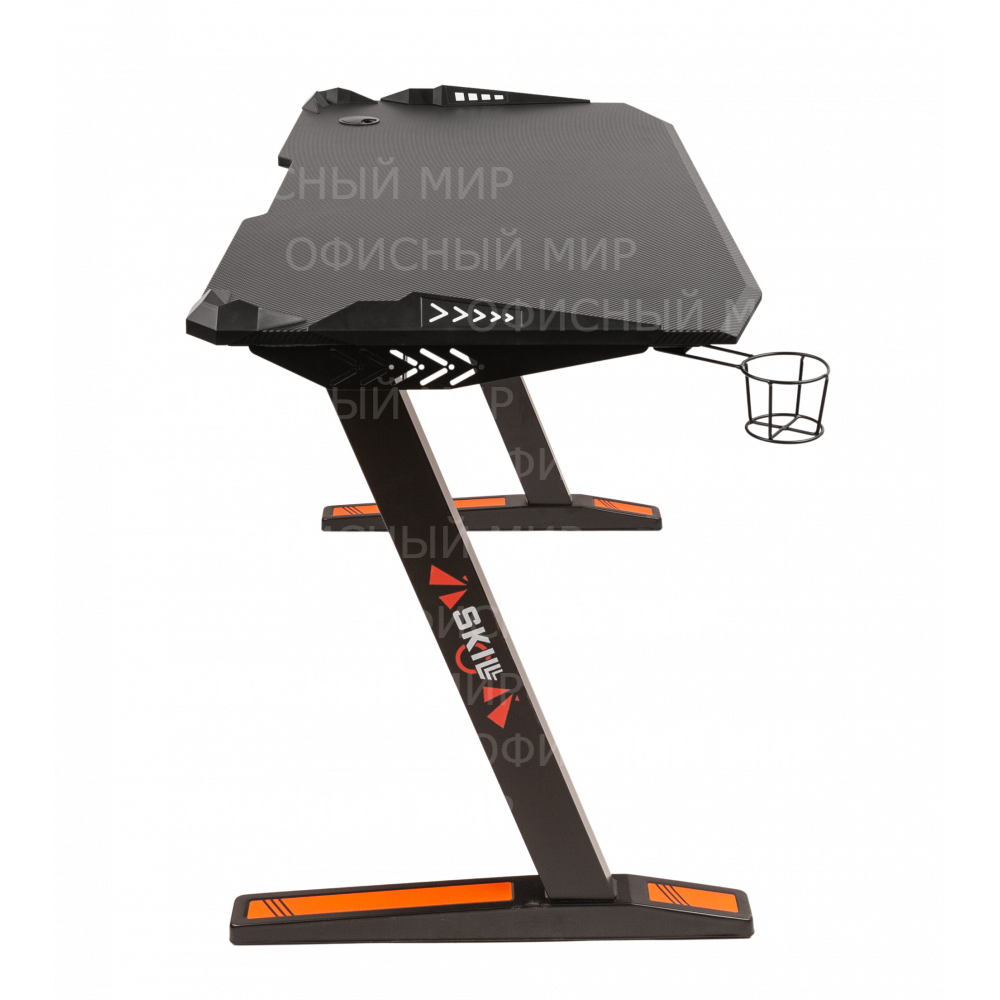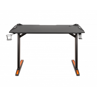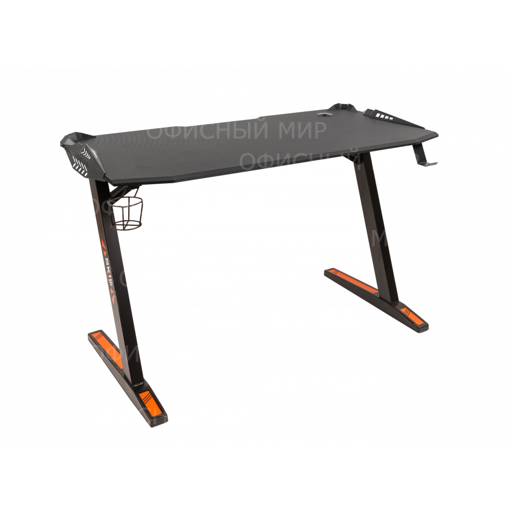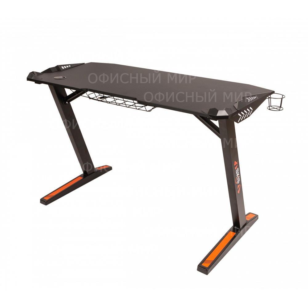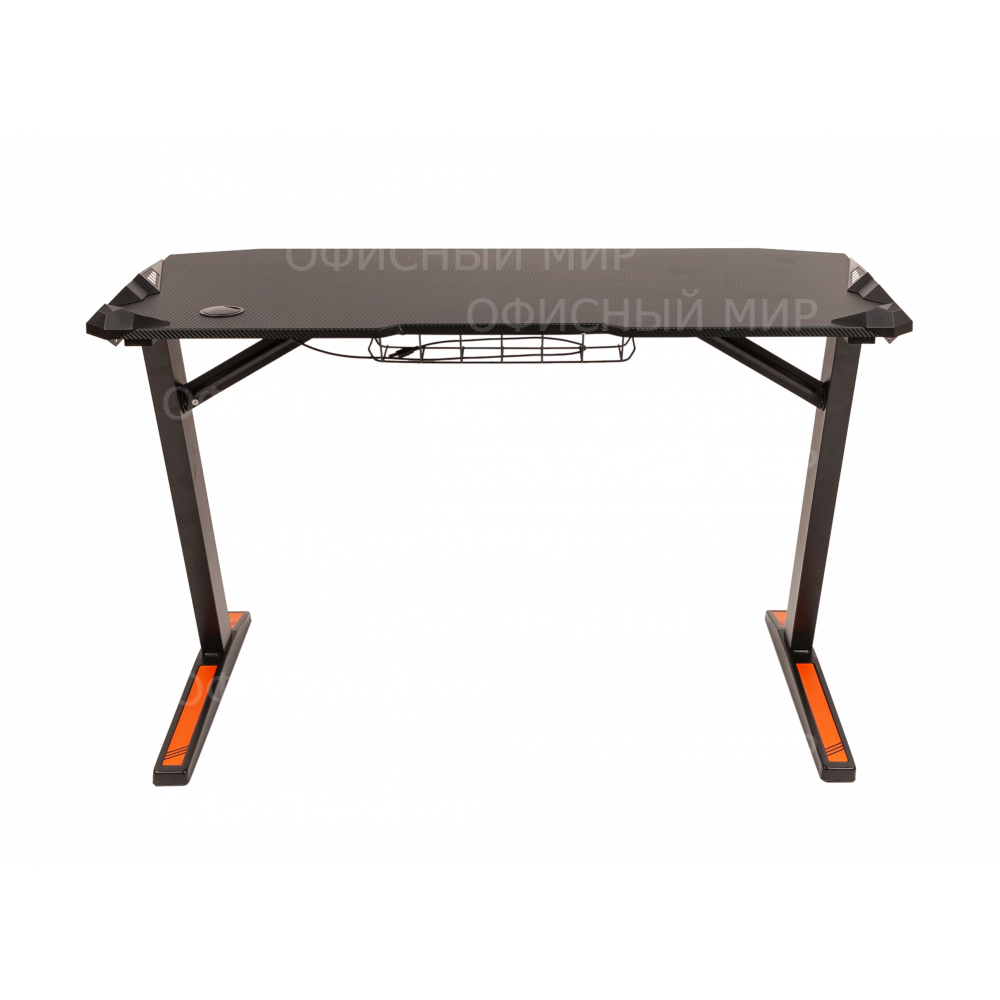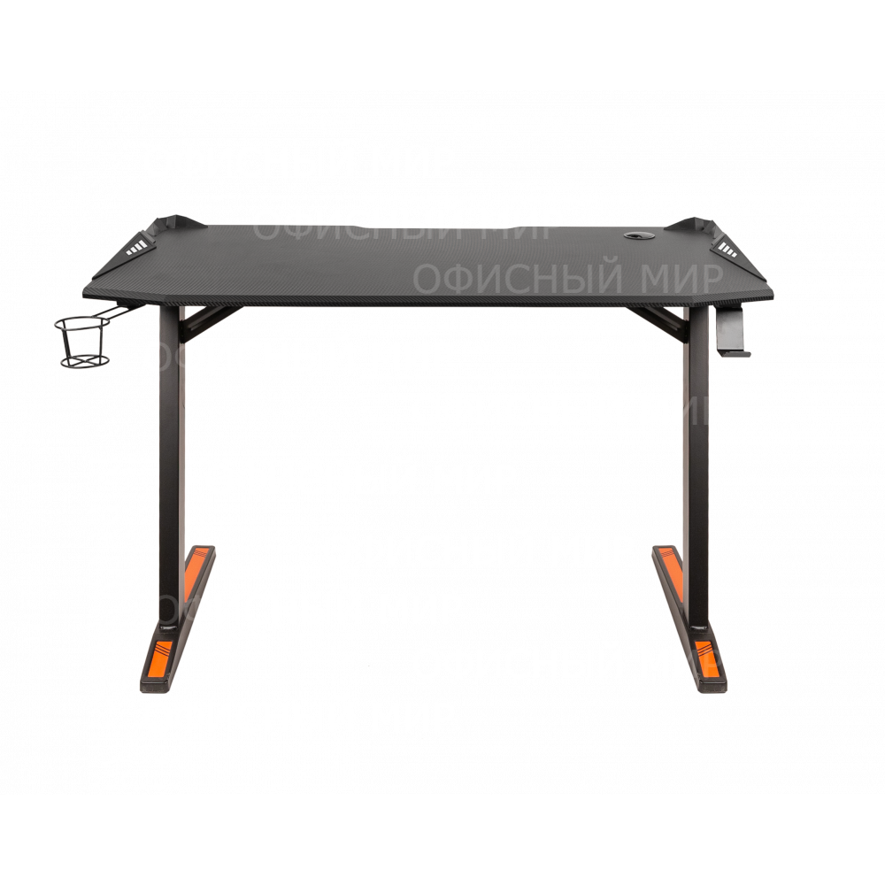 Игровой компьютерный стол с LED-подсветкой и на металлокаркасе. Эргономичная столешница со скошенным краем и оригинальными накладками, размеры - 1200x600 мм, выполнена из безопасной МДФ 19 мм. Покрытие - специальная виниловая плёнка "CARBON", цвет - чёрный. Укомплектован подставкой под напитки, крючком для вещей и наушников, кабель-каналом в столешнице и корзиной для блока питания. RGB подсветка в накладках на столешнице, управление с помощью пульта. Опоры - металлокаркас, цвет - чёрный. Регулировка опор по высоте в диапазоне до 15 мм.