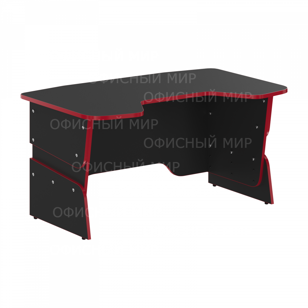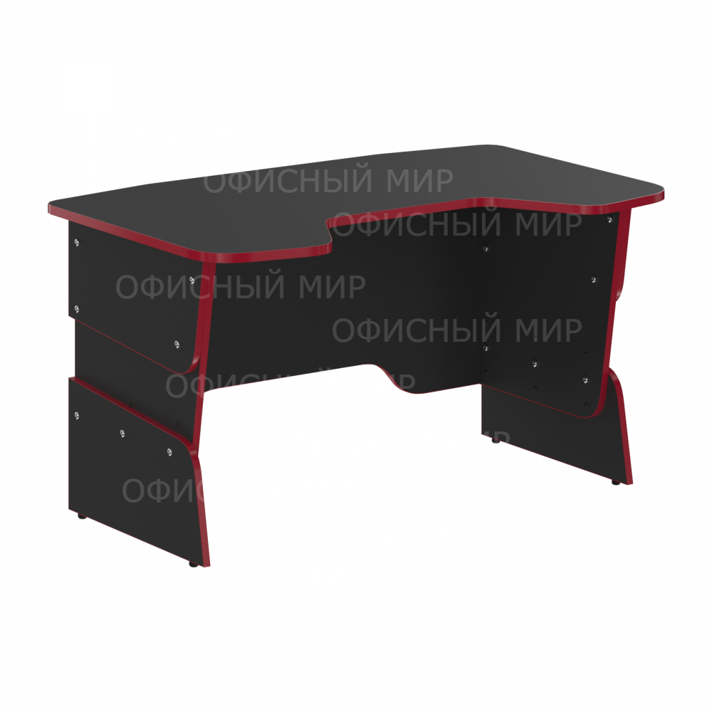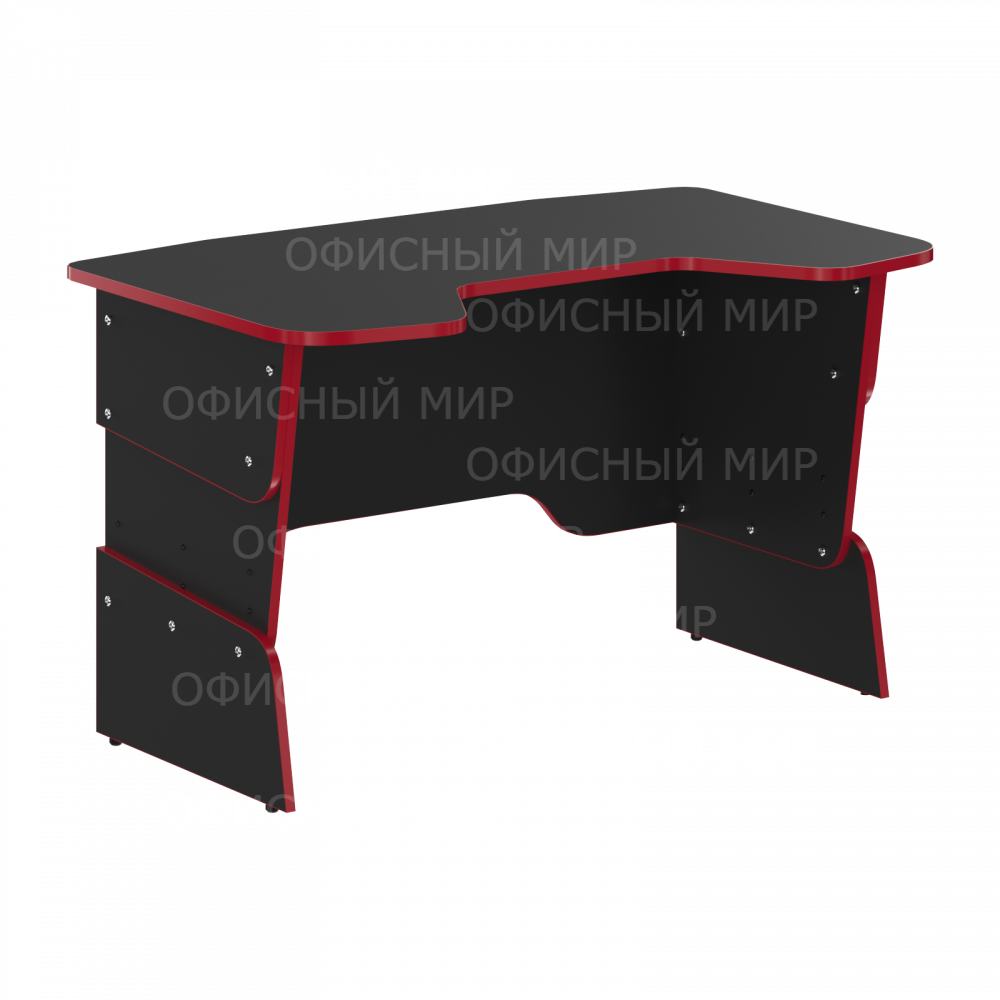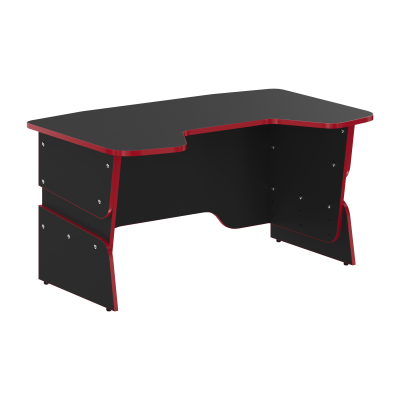 Игровой, компьютерный и письменный стол. Столешница эргономичной формы (с вырезом для удобной посадки), размеры - 1360x850 мм, выполнена из безопасной ЛДСП класс Е1, цвет - антрацит, толщина - 22 мм. Ударопрочная кромка ПВХ 2 мм, цвет - красный. Эргономичная фронтальная панель с вырезами для проводов. Опоры - составные из ЛДСП 18 мм, позволяют собирать стол в трёх положениях по высоте: 681 мм, 745 мм и 809 мм. Регулировка опор по высоте в диапазоне до 15 мм.