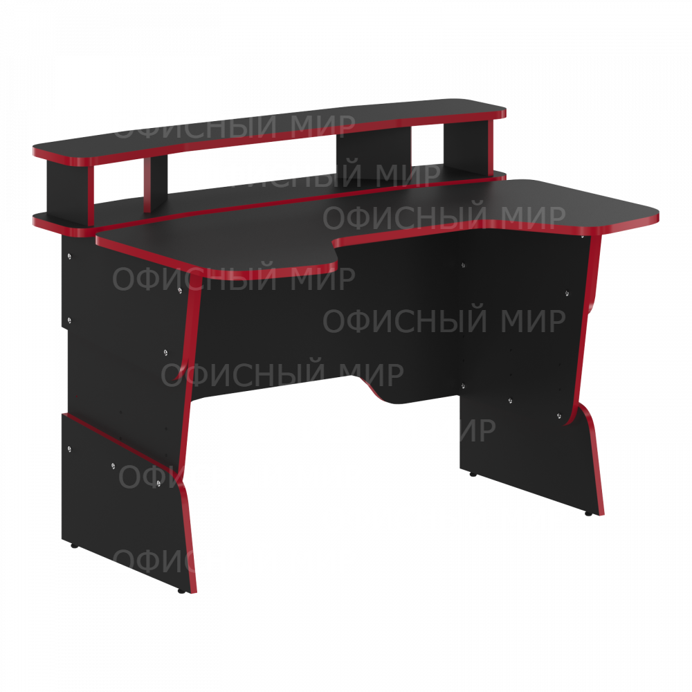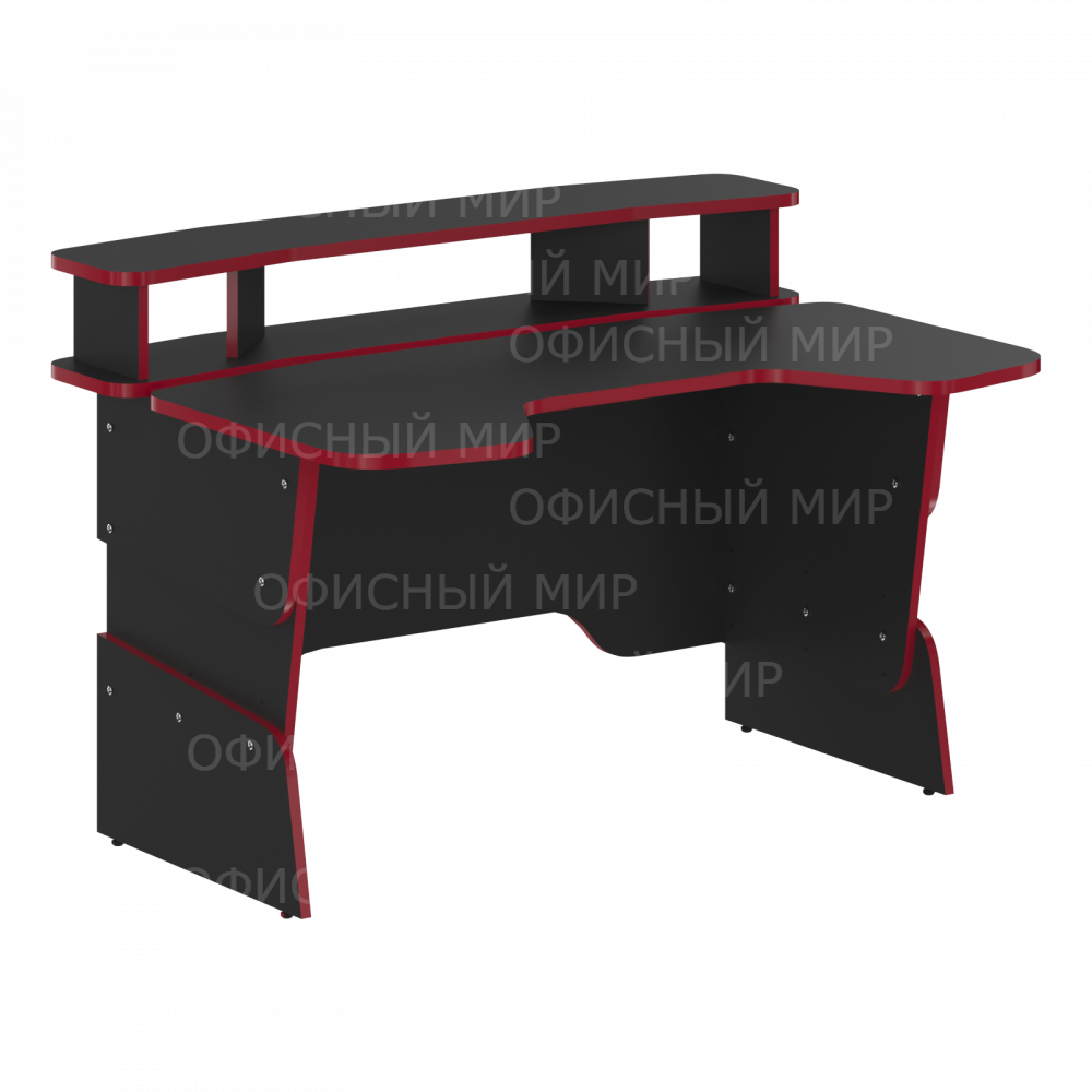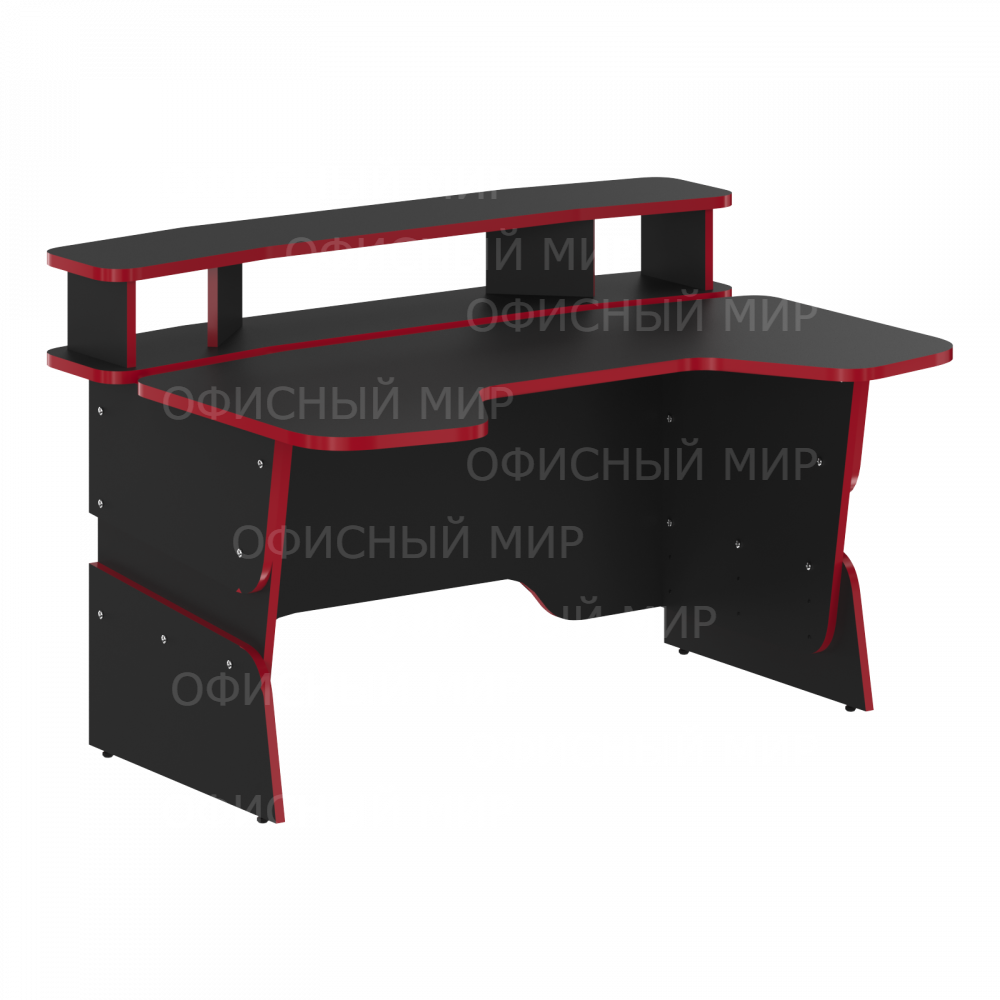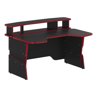 Игровой, компьютерный и письменный стол с надстройкой. Составная столешница эргономичной формы (с вырезом для удобной посадки), размеры - 1360x1000 мм, выполнена из безопасной ЛДСП класс Е1, цвет - антрацит, толщина - 22 мм. Ударопрочная кромка ПВХ 2 мм, цвет - красный. Эргономичная фронтальная панель с вырезами для проводов. Опоры - составные из ЛДСП 18 мм, позволяют собирать стол в трёх положениях по высоте: 681 мм, 745 мм и 809 мм по уровню столешницы. Регулировка опор по высоте в диапазоне до 15 мм.