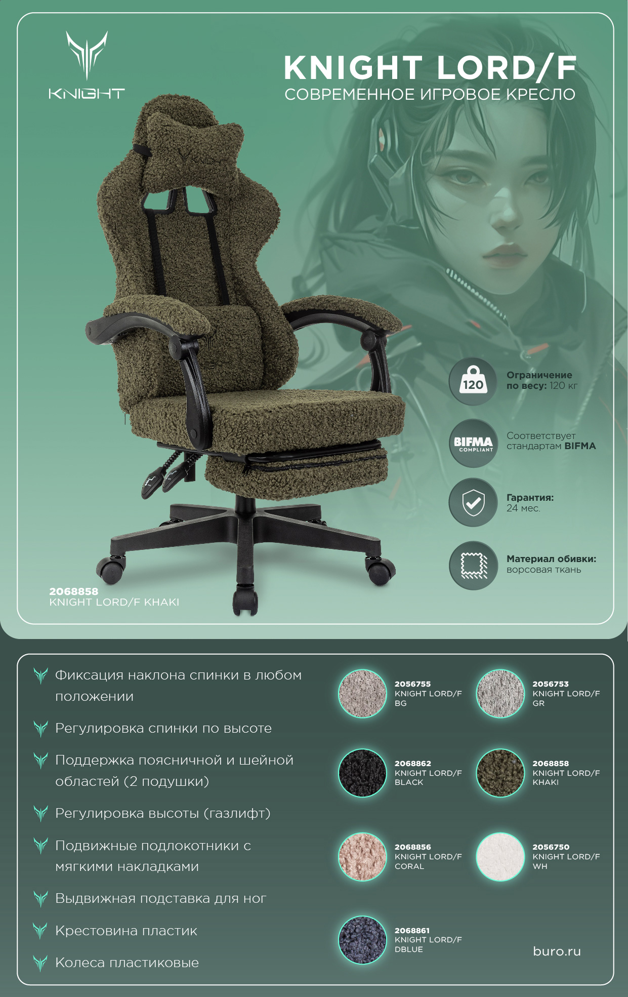Кресло игровое Knight Lord/F хаки экомех крестов. пластик подст.для ног
