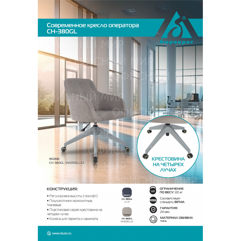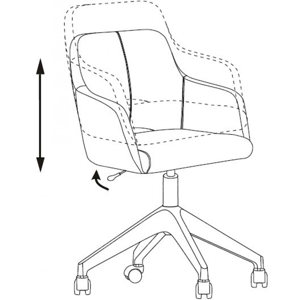 Регулировка высоты (газлифт) 4ех лучевая крестовина (серый пластик) Колеса для паркета и ламината Ограничение по весу 120 кг Соответствует стандарту BIFMA Гарантия: 24 мес.
