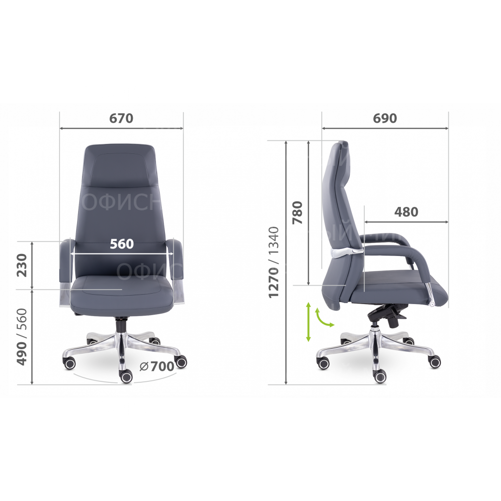 Уникальная особенность кресла - подлокотники регулируются при использовании механизма отклонения спинки и сиденья.
