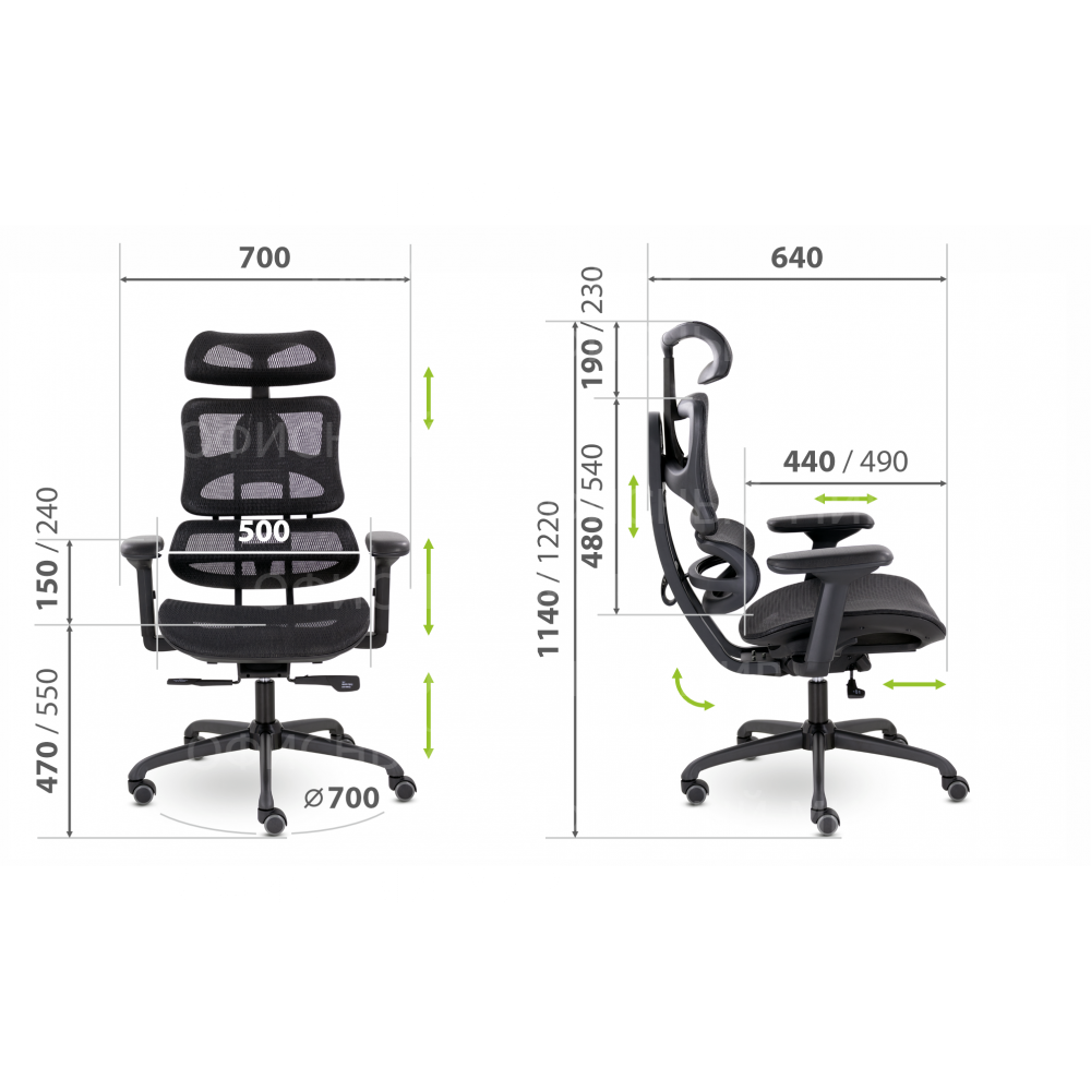 Конструкция кресла предусматривает регулируемые по высоте подлокотники с мягкими полиуретановыми накладками, которые двигаются вперед-назад.