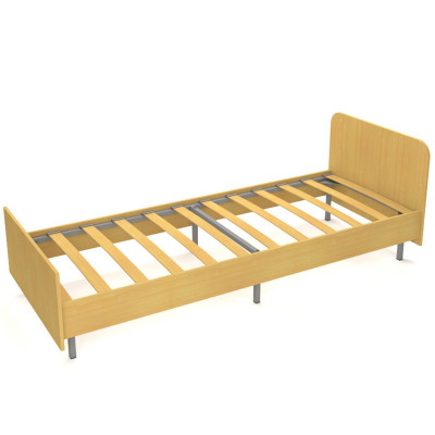 Кровать имеет стандартную форму, выполнена из прочного ЛДСП, натурального дерева и стали. Универсальный дизайн позволяет изделию вписываться в любой интерьер. В основе конструкции лежит прочный каркас, на который необходимо разместить матрас в соответствии с размерами.
