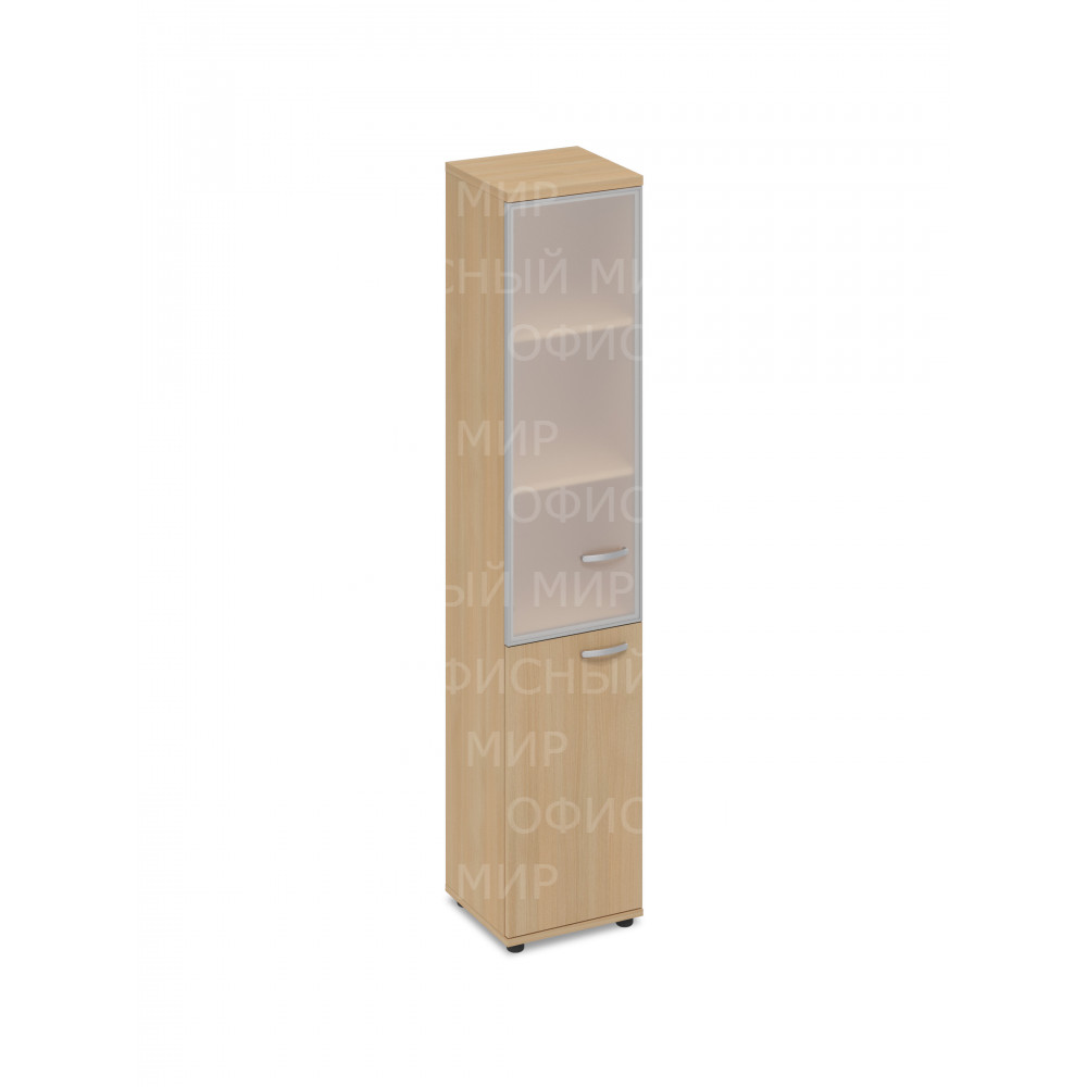 Офисный шкаф со стеклянной и глухой дверцами. Узкий левый для документов. Стеклянная дверь в алюминиевой рамке.