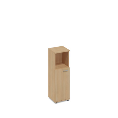 Шкаф средний узкий с открытой верхней полкой и дверцей в нижней.