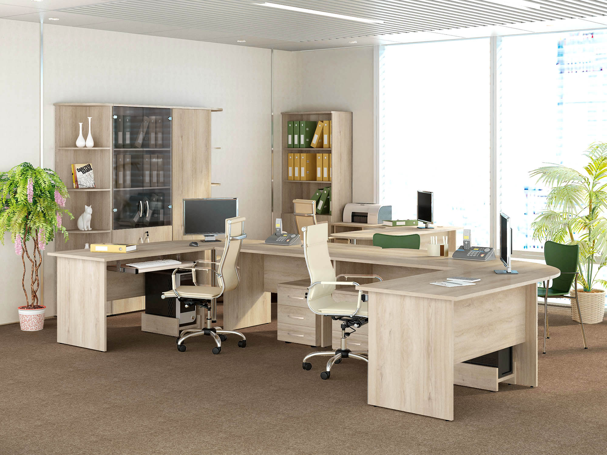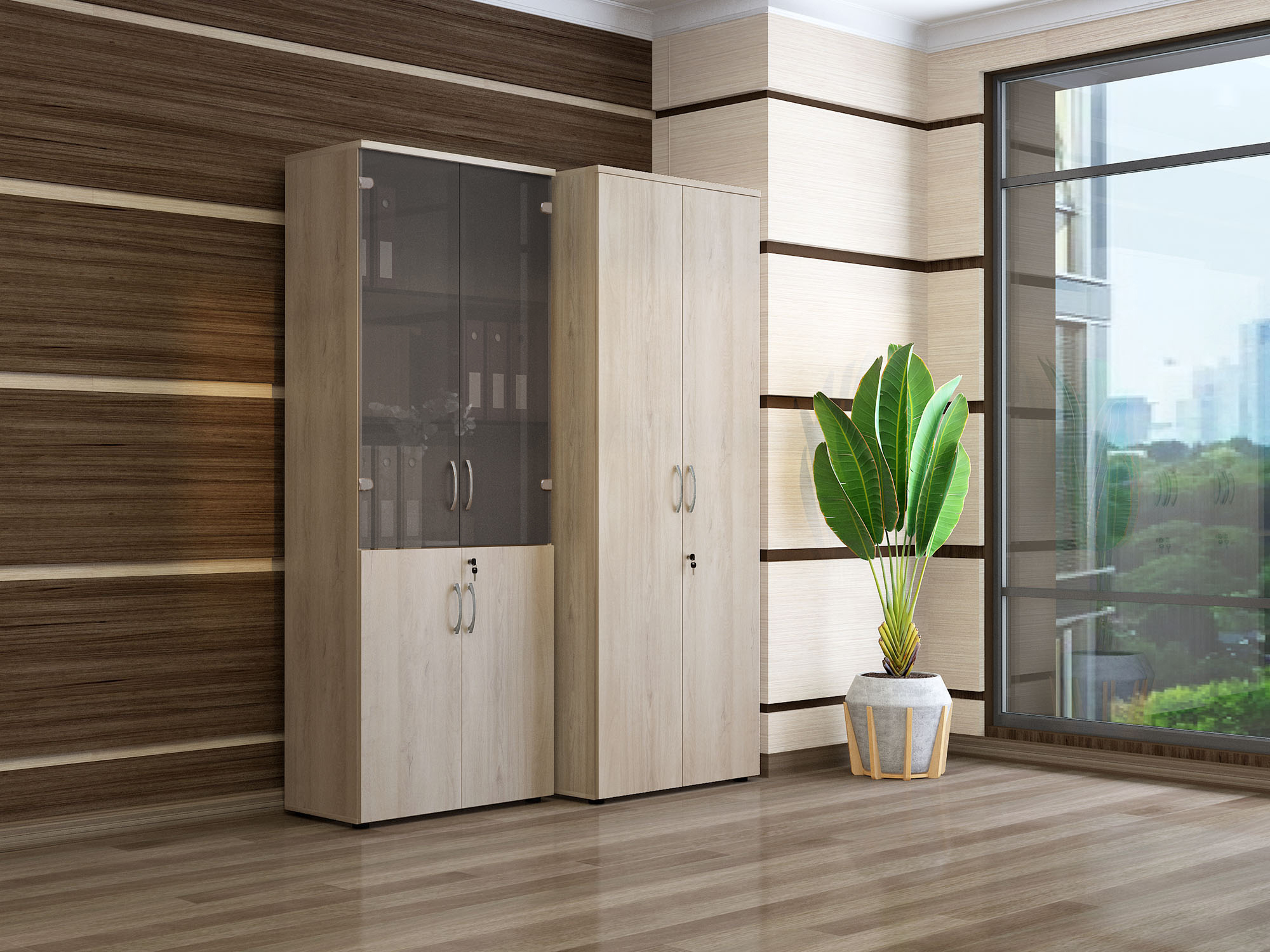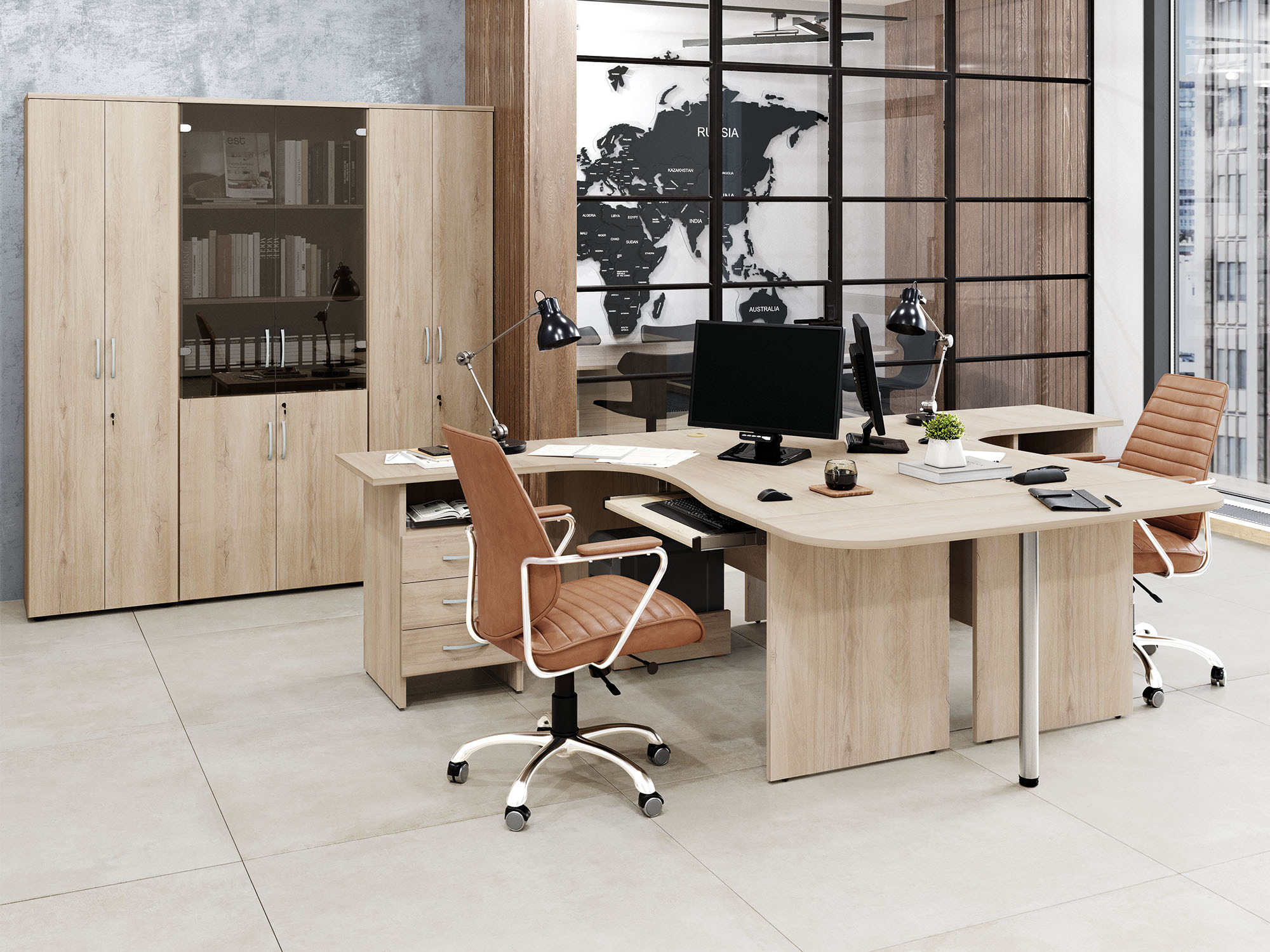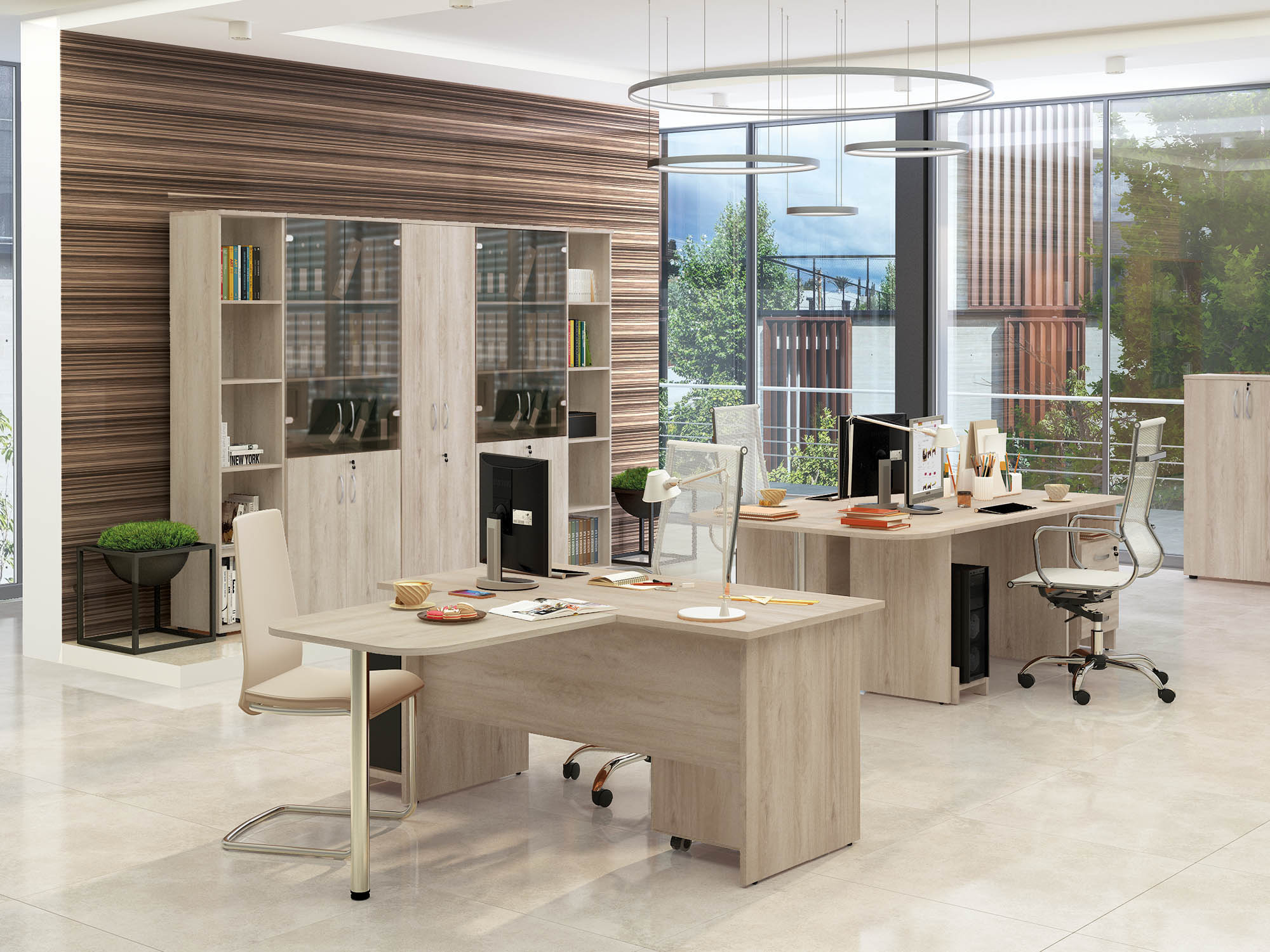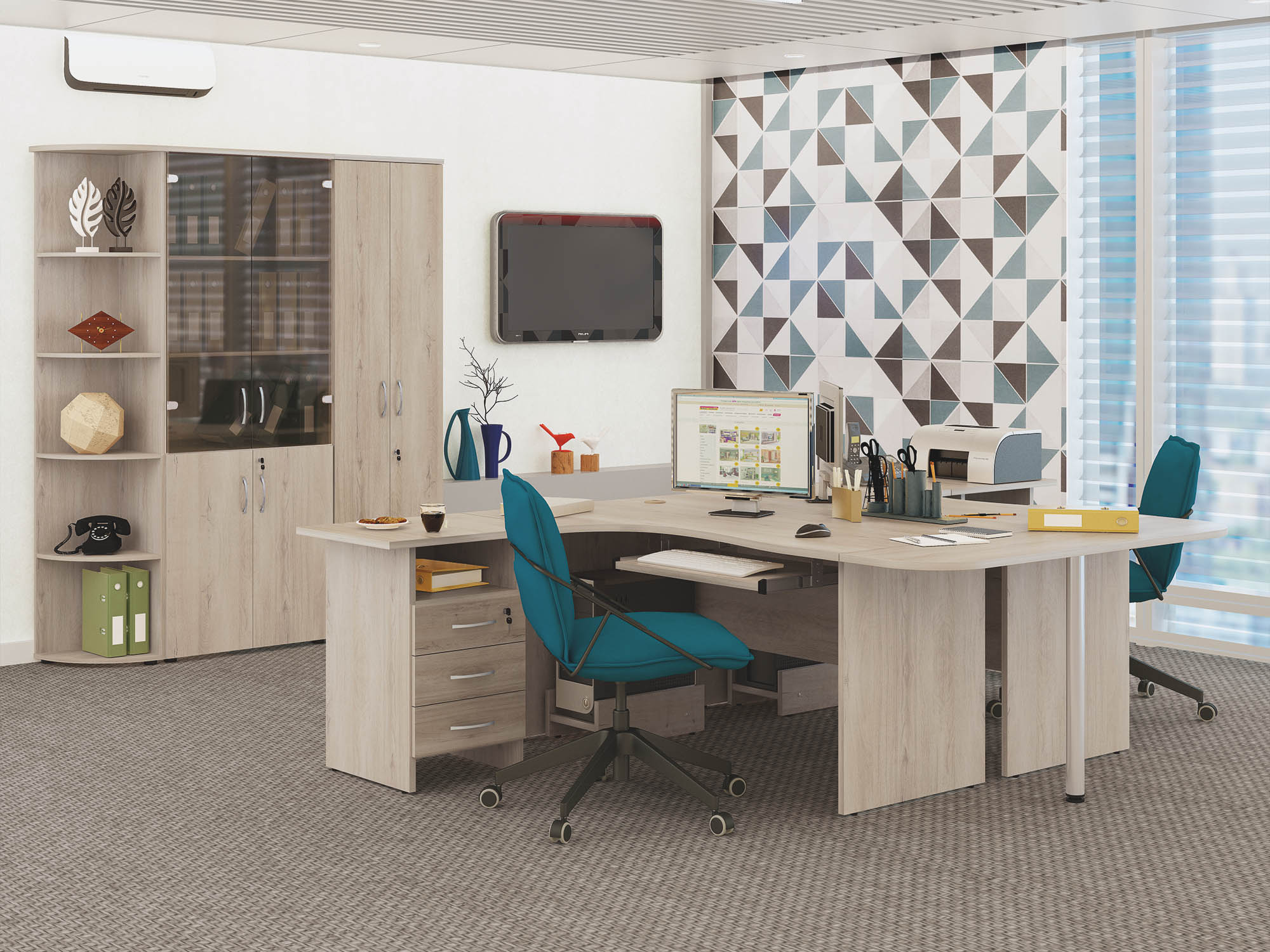 Набор мебели для персонала «Альфа 64» поможет профессионально организовать рабочее пространство в офисе. Замки на тумбах и шкафах обеспечивают безопасное хранение вещей. Демпферы обеспечивают мягкое закрывание дверей. Регулируемые по высоте ножки компенсируют возможные неровности пола. Металлические ручки подчеркивают современный дизайн модулей.