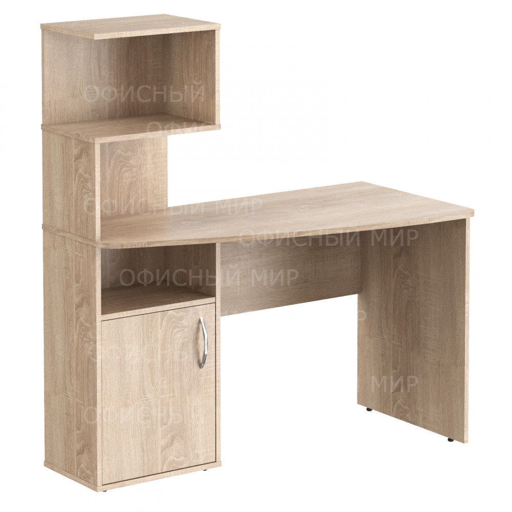 "Элегантный компьютерный стол с тумбой и функциональной надстройкой. Достаточно компактный - и при этом гарантирующий комфорт в работе и позволяющий разместить все, что нужно, в зоне моментальной доступности. Тумба оснащена открытой полкой и секцией с дверью.