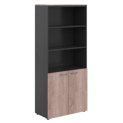 Широкий шкаф-стеллаж WAVE для офисного или домашнего использования. Размеры - 856х1949х432 мм, цвет корпуса - Легно Темный, цвет дверей - Дуб Сонома. Шкаф имеет солидный топ из МДФ – 19 мм. Двустворчатый шкаф-стеллаж оснащенный 5 просторными полками, две нижние полки закрыты дверцами из ЛДСП, три верхние - открытые. На дверцах установлены долговечные и стильные металлические ручки. Конструкция шкафа оснащена прочными силовыми креплениями – эксцентриковыми стяжками. Регулируемые по высоте опоры обеспечат шкафу устойчивость на неровном полу.