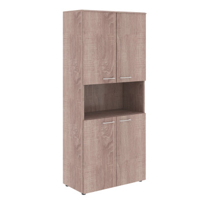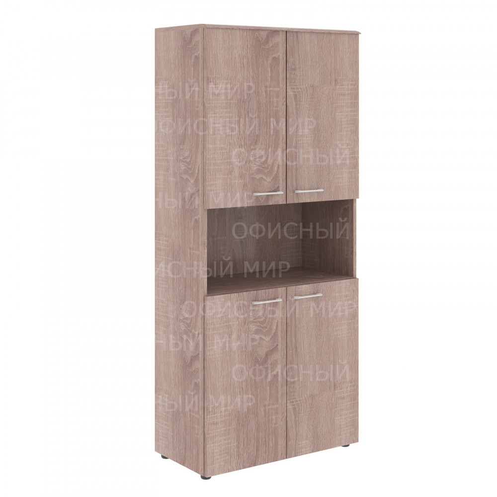 Широкий и высокий шкаф WAVE для офисного или домашнего использования. Размеры - 856х1949х432 мм, цвет - Дуб Сонома. Шкаф имеет солидный топ из МДФ 19 мм Двустворчатый шкаф оснащенный 5 просторными полками, две нижние и две верхние полки отдельно закрываются дверцами из ЛДСП, а посередине открытая ниша. На всех дверцах имеются долговечные и стильные металлические ручки. Конструкция шкафа оснащена прочными силовыми креплениями – эксцентриковыми стяжками. Регулируемые по высоте опоры обеспечат шкафу устойчивость на неровном полу.