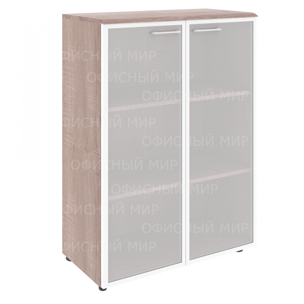 Широкий шкаф средний WAVE для офисного или домашнего использования. Размеры - 856х1184х432 мм, цвет - Дуб Сонома. Шкаф имеет солидный топ из МДФ – 19 мм. Двустворчатый шкаф оснащенный 3 просторными полками, которые закрыты стеклянными дверцами со стильной матовой тонировкой в металлической рамке. На дверцах установлены долговечные и стильные металлические ручки. Конструкция шкафа оснащена прочными силовыми креплениями – эксцентриковыми стяжками. Регулируемые по высоте опоры обеспечат шкафу устойчивость на неровном полу.