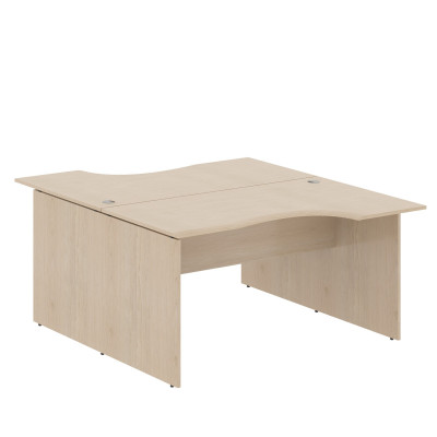 Универсальная рабочая станция на 2 рабочих места WAVE для офисного или домашнего использования, размер – 1400х1800х750 мм, цвет – Бук Тиара. Оснащена надежными и долговечными опорами из ЛДСП 18 мм, которые расположены по краям стола. Между столешницей и опорами установлены специальные проставки, что создает эффект «парящей столешницы». Солидная и прочная столешница из МДФ 19 мм оригинальной эргономичной формы, в которой установлены 2 кабель-канала с декоративными заглушками. Столешницы можно разделить с помощью перегородки, что позволит создать изолированные рабочие места. Фрезерованные края столешниц гарантируют отсутствие острых углов, благодаря чему работать за ними комфортно, а плавные линии придают дизайну «объемный» вид. Надежная защита торцов всех элементов из ЛДСП - кромка ПВХ. Конструкция стола оснащена прочными силовыми креплениями – эксцентриковыми стяжками. Регулируемые по высоте опоры обеспечат столу устойчивость на неровном полу.