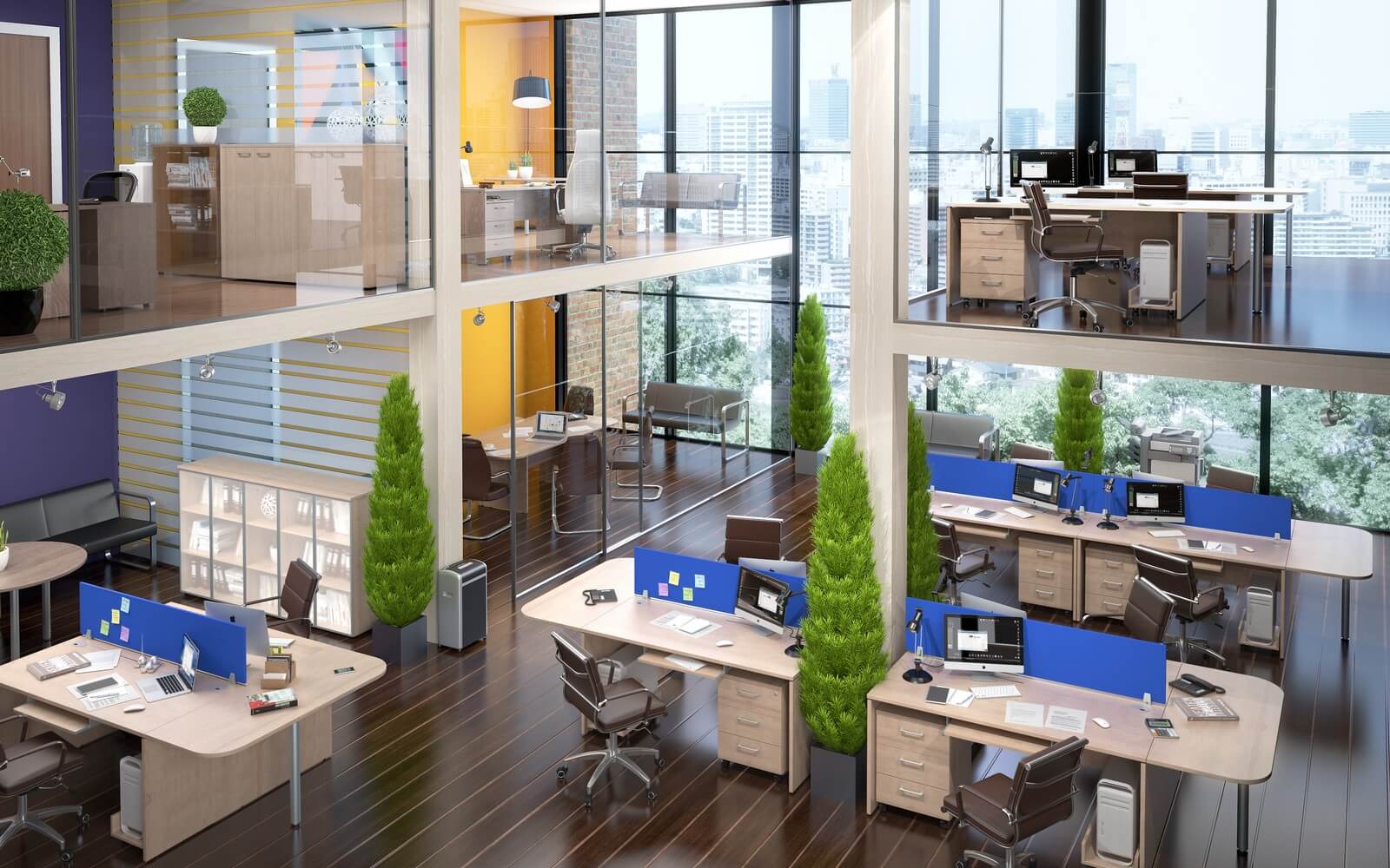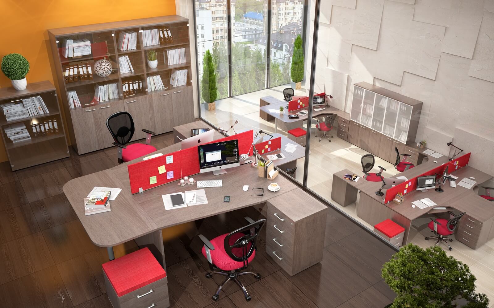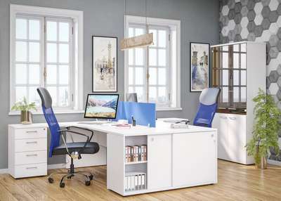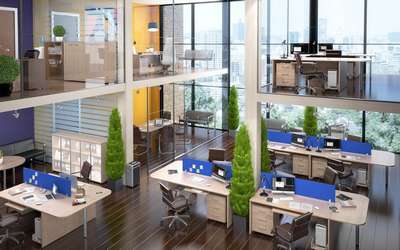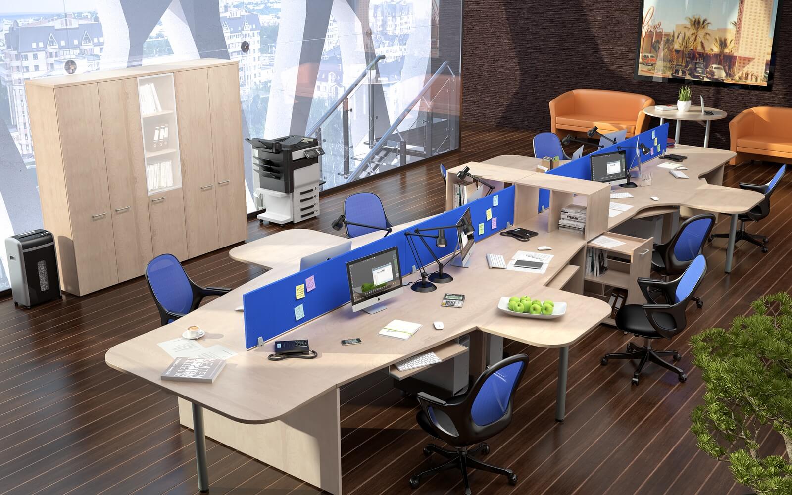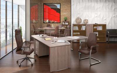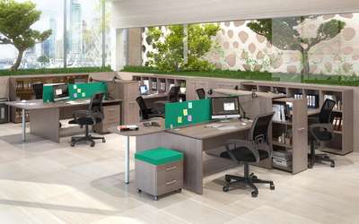 Бескомпромиссное сочетание солидности широких опор с легкостью «парящей» столешницы, приглушающие звук тканевые перегородки, дополнительные места для сидения в виде мобильных тумб с мягкими подушками, широкий модельный ряд, позволяющий формировать не только отдельные рабочие места, но и многоместные рабочие станции, а также полноценные кабинеты руководителей, и, конечно же, самая эффектная и современная цветовая гамма.