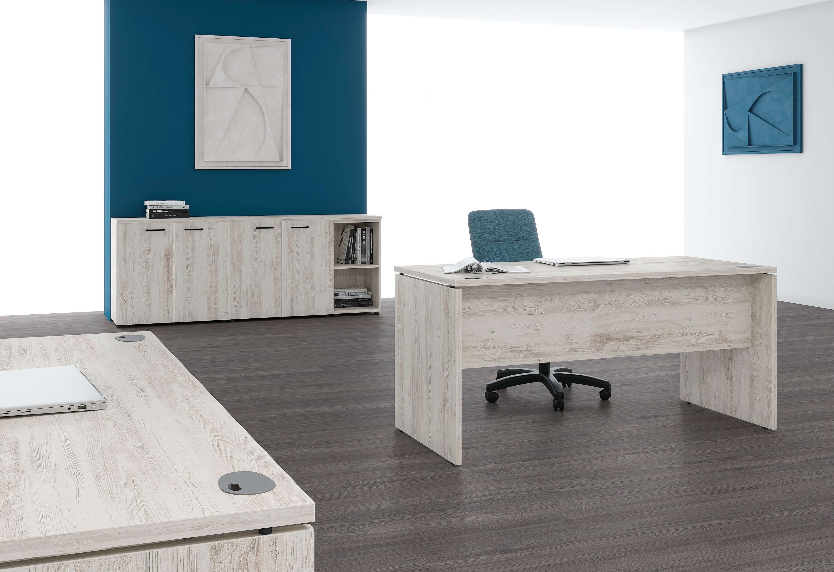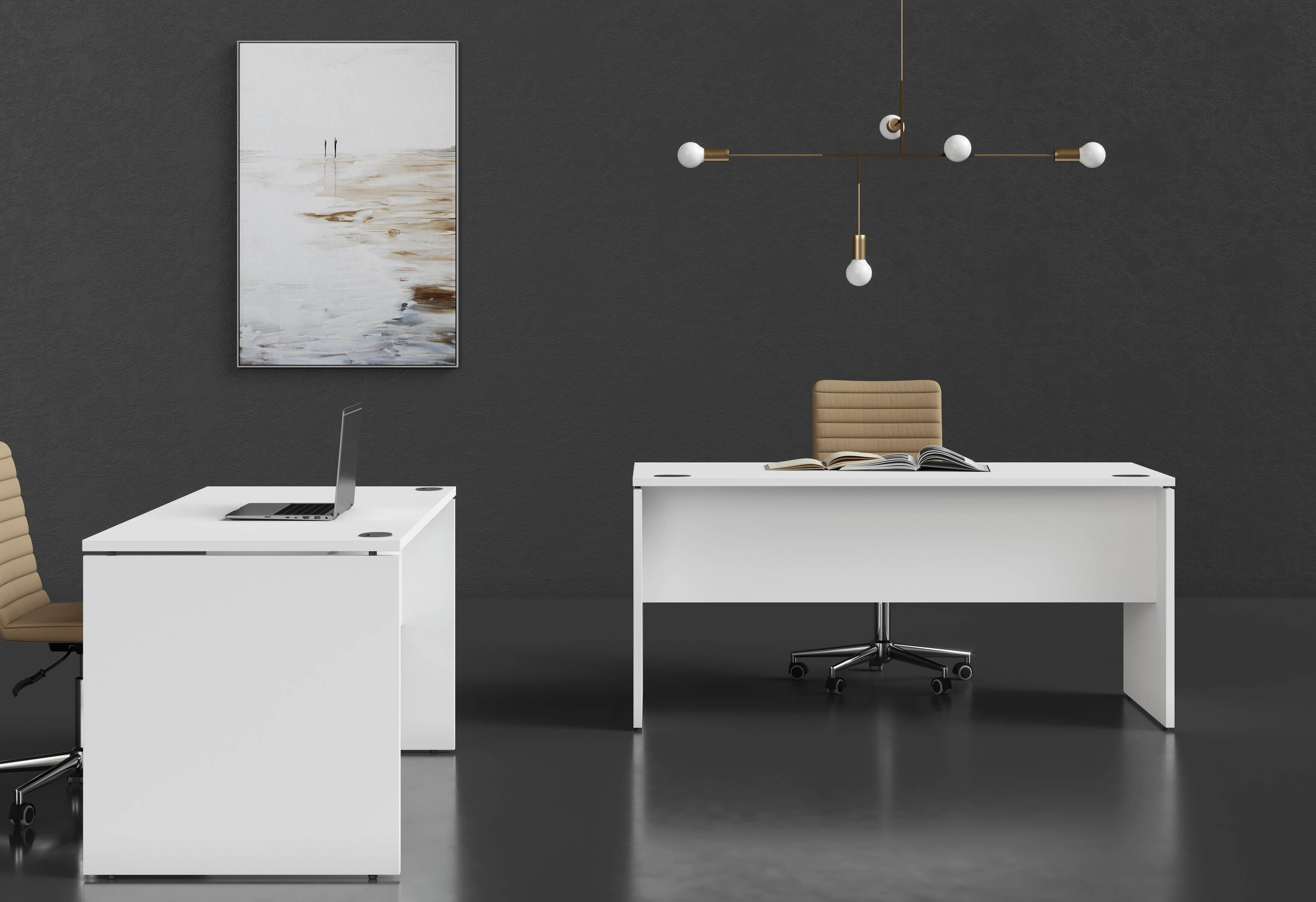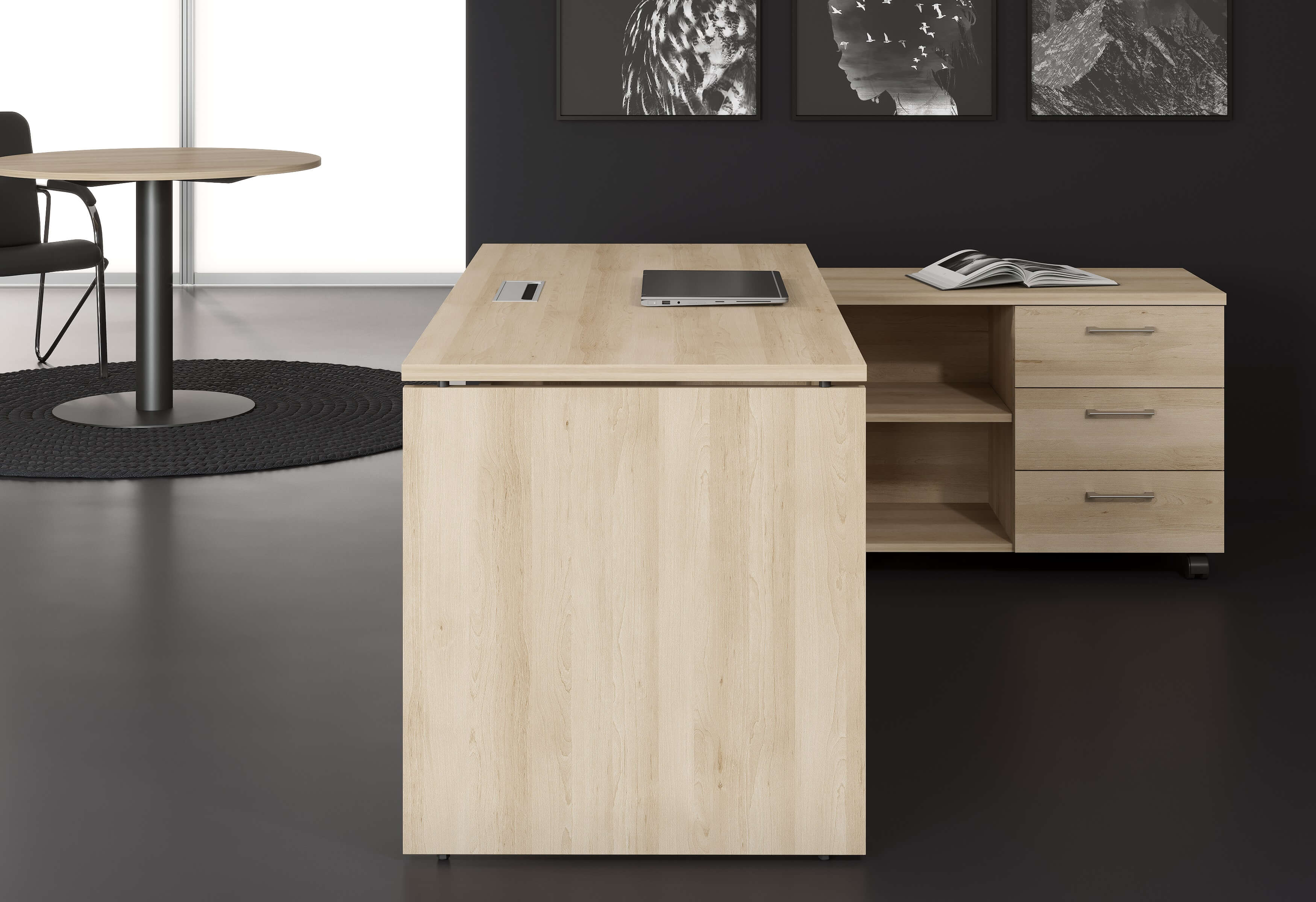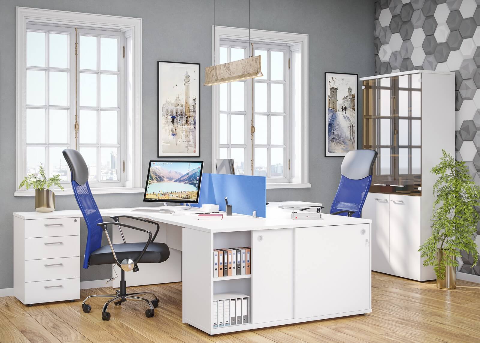 Бескомпромиссное сочетание солидности широких опор с легкостью «парящей» столешницы, приглушающие звук тканевые перегородки, дополнительные места для сидения в виде мобильных тумб с мягкими подушками, широкий модельный ряд, позволяющий формировать не только отдельные рабочие места, но и многоместные рабочие станции, а также полноценные кабинеты руководителей, и, конечно же, самая эффектная и современная цветовая гамма.