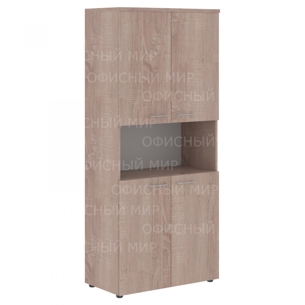 Широкий и высокий шкаф XTEN для офисного или домашнего использования. Размеры - 856х1955х432 мм, цвет - Дуб Сонома. Оснащен 5 полками, 2 нижние и 2 верхние отдельно закрываются дверцами из ЛДСП, посередине – открытая ниша. На дверцах установлены долговечные и стильные металлические ручки. Конструкция шкафа оснащена прочными силовыми креплениями – эксцентриковыми стяжками. Надежная защита торцов всех элементов - кромка ПВХ. Регулируемые по высоте опоры обеспечат шкафу устойчивость на неровном полу.