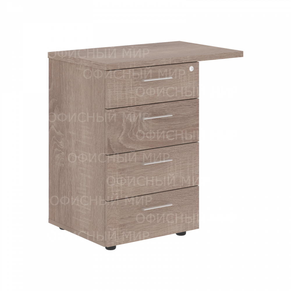 Универсальная приставная тумба XTEN для офисного или домашнего использования. Размеры - 700х750х450 мм, цвет - Дуб Сонома. Тумба оснащена солидным и увеличенным верхним топом - 25 мм, для более удобного присоединения к столу. Надежная защита торцевых поверхностей - кромка ПВХ 2 мм. Количество ящиков – 4, с долговечными и стильными металлическими ручками. Тумба оснащена центральным замком, позволяющим закрывать все ящики одним поворотом ключа. Конструкция тумбы оснащена прочными силовыми креплениями – эксцентриковыми стяжками. Регулируемые по высоте опоры обеспечат тумбе устойчивость на неровном полу.