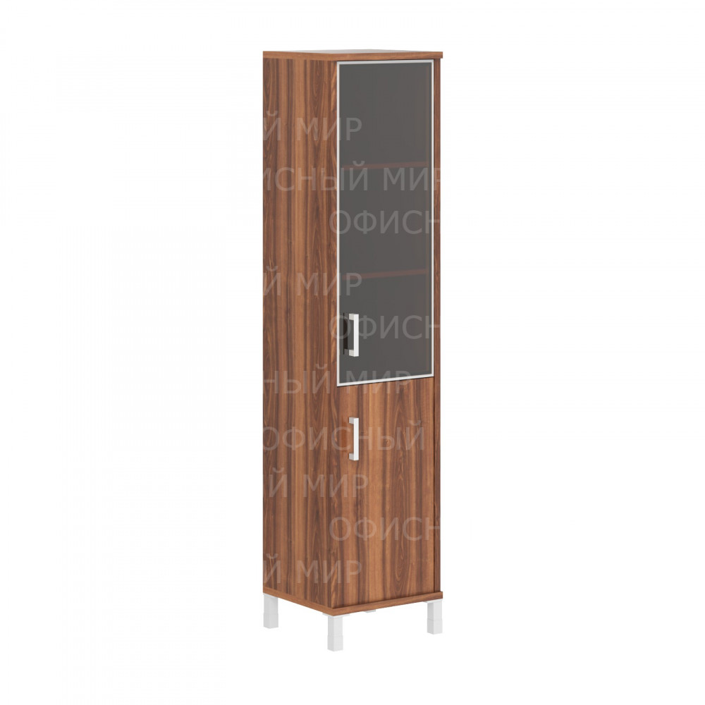 Универсальный комбинированный шкаф BORN для офисного или домашнего использования. Размеры - 475х2054х450 мм, тип – правосторонний, цвет – Орех Даллас. Шкаф имеет опоры увеличенной длины. Оснащен 5 полками, две нижние закрыты дверцей из ЛДСП под цвет конструкции, три верхние – стеклянной дверцей с металлической рамкой по краям. На дверцах установлены стильные металлические ручки. Конструкция шкафа оснащена прочными силовыми креплениями – эксцентриковыми стяжками. Все торцы основных элементов шкафа надежно защищены кромкой ПВХ – 2 мм. Регулируемые по высоте опоры обеспечат шкафу устойчивость на неровном полу.