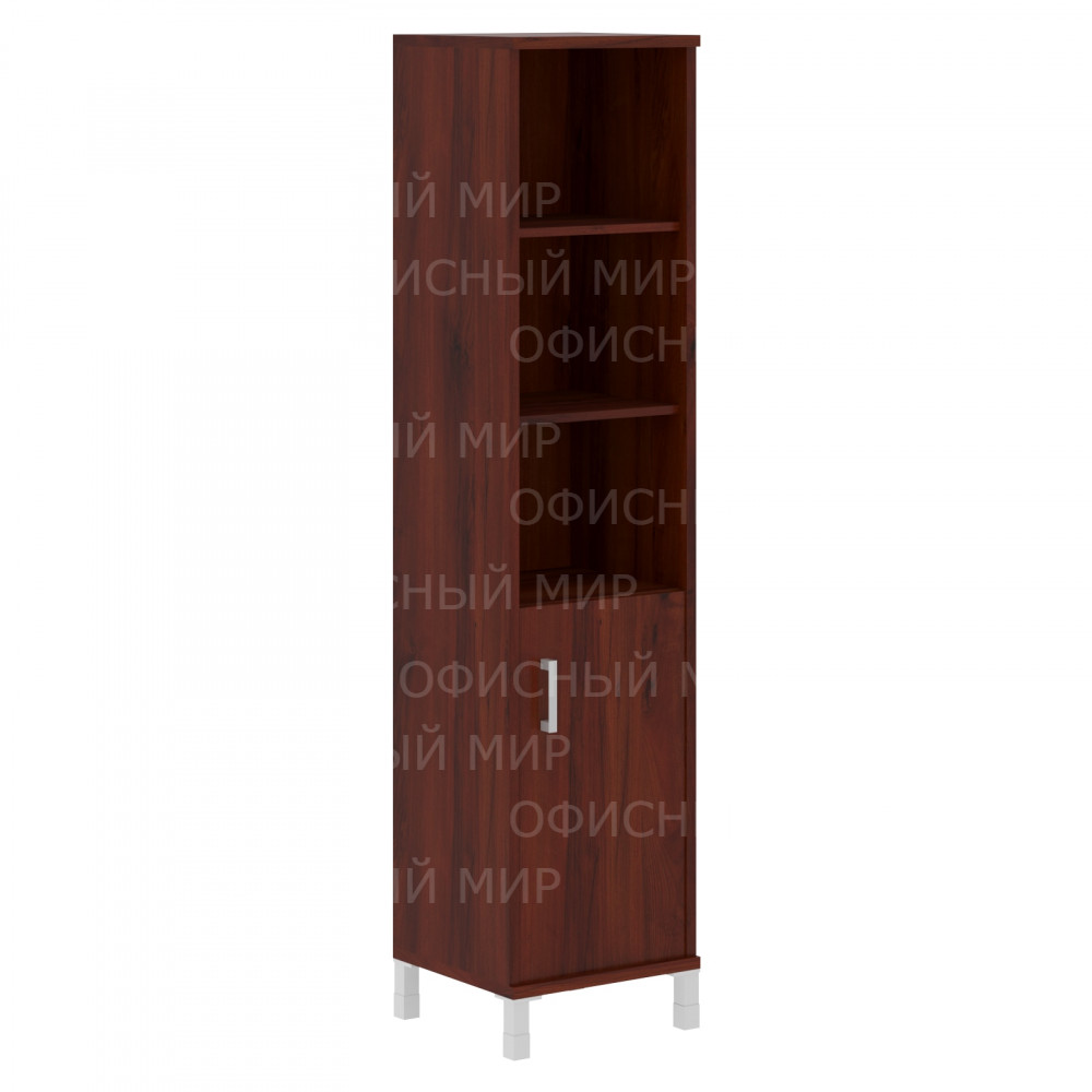 Универсальный шкаф-стеллаж BORN для офисного или домашнего использования. Размеры - 475х2054х450 мм, тип – правосторонний, цвет - Бургунди. Шкаф имеет опоры увеличенной длины. Оснащен 5 полками, две нижние закрыты дверцей из ЛДСП под цвет конструкции, три верхние – открытые. На дверце установлена стильная металлическая ручка. Конструкция шкафа оснащена прочными силовыми креплениями – эксцентриковыми стяжками. Все торцы основных элементов шкафа надежно защищены кромкой ПВХ – 2 мм. Регулируемые по высоте опоры обеспечат шкафу устойчивость на неровном полу.