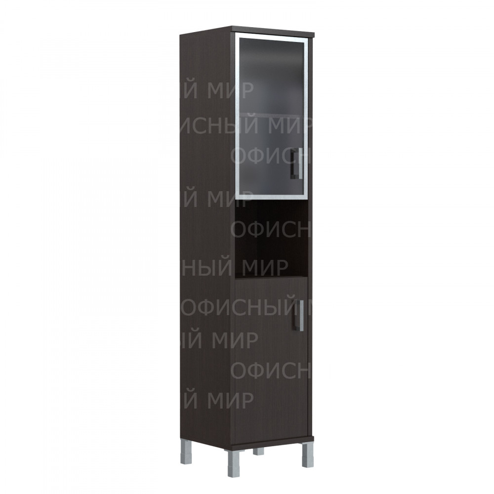 Компактный и высокий комбинированный шкаф BORN для офисного или домашнего использования. Размеры - 475х2054х450 мм, тип – левосторонний, цвет – Венге Магия. Оснащен 5 просторными полочками, 2 нижние закрываются дверцей из ЛДСП, 2 верхние – стеклянной дверцей с металлической рамкой, а посередине одна открытая полочка. На дверцах установлены стильные металлические ручки. Шкаф имеет опоры увеличенной длины. Конструкция оснащена прочными силовыми креплениями – эксцентриковыми стяжками. Все торцы основных элементов шкафа надежно защищены кромкой ПВХ – 2 мм. Регулируемые по высоте опоры обеспечат шкафу устойчивость на неровном полу.