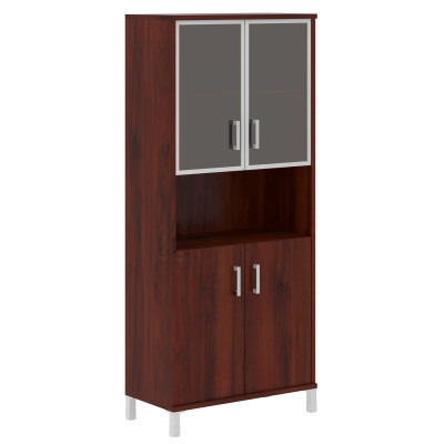 Универсальный комбинированный шкаф BORN для офисного или домашнего использования. Размеры - 900х2054х450 мм, цвет – Бургунди. Оснащен 5 просторными полочками, 2 нижние закрываются дверцами из ЛДСП, 2 верхние – стеклянными дверцами с металлической рамкой, а посередине одна открытая полочка. На дверцах установлены стильные металлические ручки. Шкаф имеет опоры увеличенной длины. Конструкция оснащена прочными силовыми креплениями – эксцентриковыми стяжками. Все торцы основных элементов шкафа надежно защищены кромкой ПВХ – 2 мм. Регулируемые по высоте опоры обеспечат шкафу устойчивость на неровном полу.