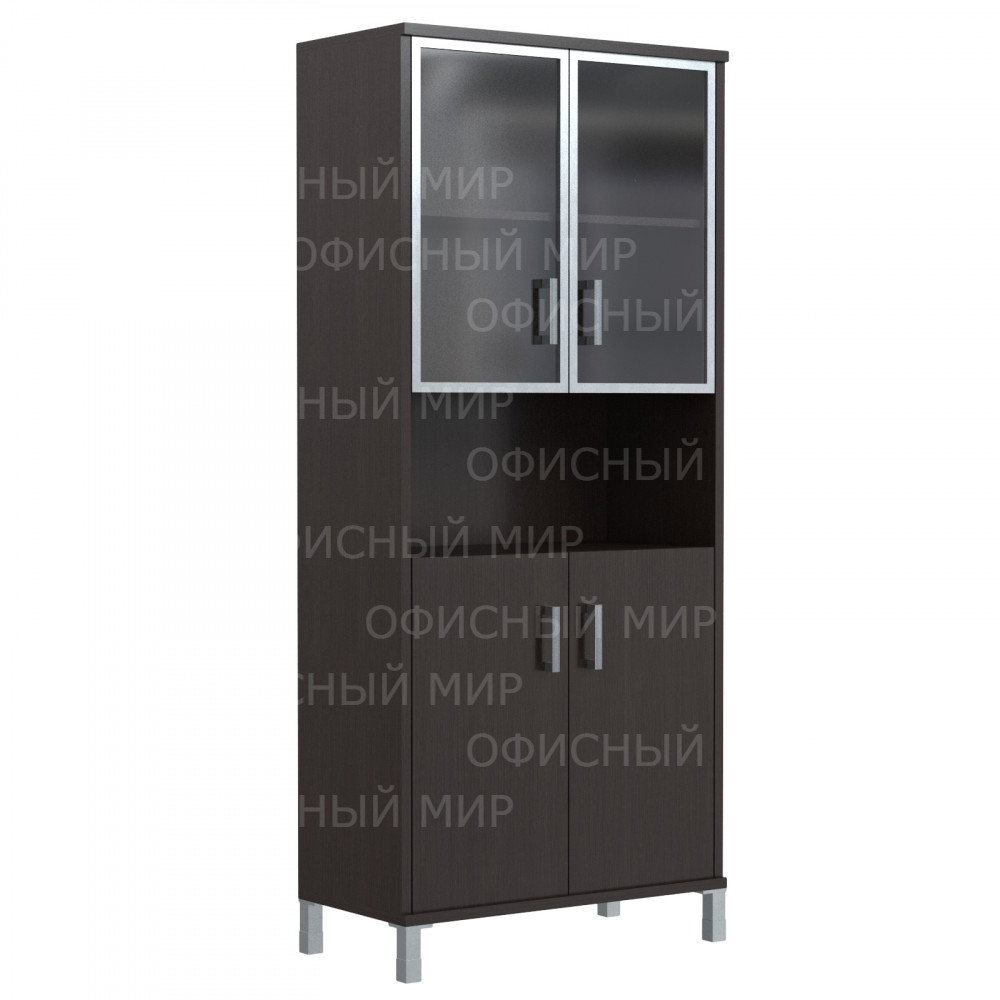 Универсальный комбинированный шкаф BORN для офисного или домашнего использования. Размеры - 900х2054х450 мм, цвет – Венге Магия. Оснащен 5 просторными полочками, 2 нижние закрываются дверцами из ЛДСП, 2 верхние – стеклянными дверцами с металлической рамкой, а посередине одна открытая полочка. На дверцах установлены стильные металлические ручки. Шкаф имеет опоры увеличенной длины. Конструкция оснащена прочными силовыми креплениями – эксцентриковыми стяжками. Все торцы основных элементов шкафа надежно защищены кромкой ПВХ – 2 мм. Регулируемые по высоте опоры обеспечат шкафу устойчивость на неровном полу.