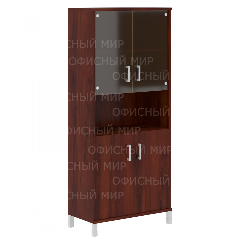 Универсальный комбинированный шкаф BORN для офисного или домашнего использования. Размеры - 900х2054х450 мм, цвет – Бургунди. Оснащен 5 просторными полочками, 2 нижние закрываются дверцами из ЛДСП, 2 верхние – стеклянными, а посередине одна открытая полочка. На дверцах установлены стильные металлические ручки. Шкаф имеет опоры увеличенной длины. Конструкция оснащена прочными силовыми креплениями – эксцентриковыми стяжками. Все торцы основных элементов шкафа надежно защищены кромкой ПВХ – 2 мм. Регулируемые по высоте опоры обеспечат шкафу устойчивость на неровном полу.