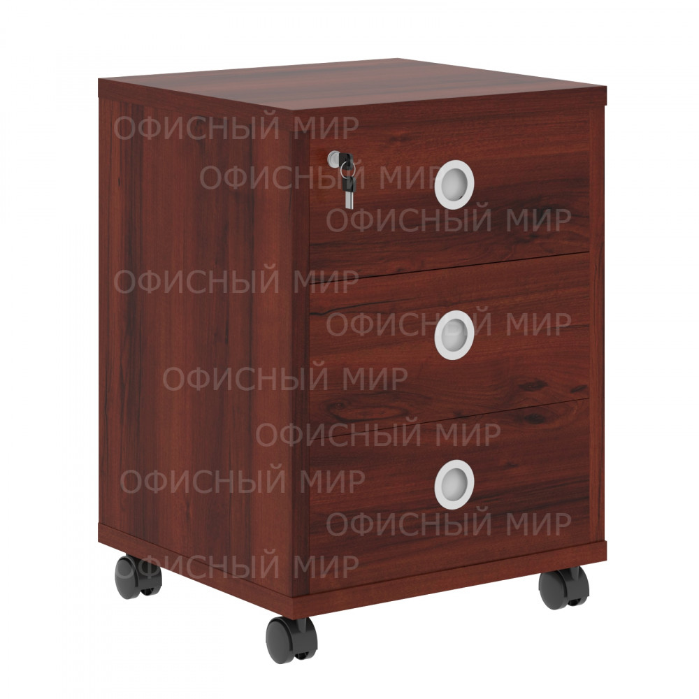Универсальная мобильная тумба BORN для офисного или домашнего использования. Размеры - 480х660х455 мм, цвет - Бургунди. Количество ящиков - 3. Ящики тумбы оснащены центральным замком и декорированы стильными круглыми металлическими ручками. Конструкция тумбы оснащена прочными силовыми креплениями – эксцентриковыми стяжками. Все торцы основных элементов тумбы надежно защищены кромкой ПВХ – 2 мм. Удобные колесики с плавным ходом.