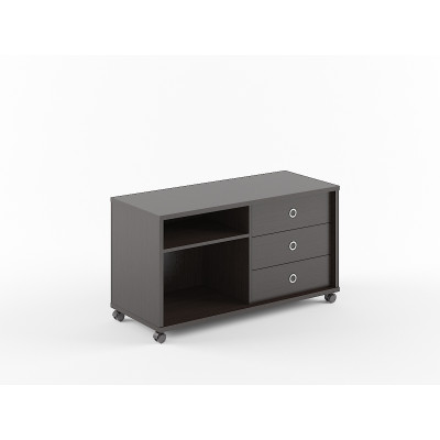 Универсальная сервисная тумба BORN для офисного или домашнего использования. Размеры - 1200х660х500 мм, цвет - Венге Магия. Тумба разделена на две части, с одной стороны она оснащена ящиками, с другой – открытыми полочками. Количество ящиков – 3, количество полочек – 2. Ящики тумбы декорированы стильными круглыми металлическими ручками. Конструкция тумбы оснащена прочными силовыми креплениями – эксцентриковыми стяжками. Все торцы основных элементов тумбы надежно защищены кромкой ПВХ – 2 мм. Удобные колесики с плавным ходом.