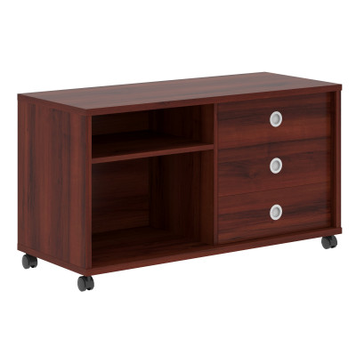 Универсальная сервисная тумба BORN для офисного или домашнего использования. Размеры - 1200х660х500 мм, цвет - Бургунди. Тумба разделена на две части, с одной стороны она оснащена ящиками, с другой – открытыми полочками. Количество ящиков – 3, количество полочек – 2. Ящики тумбы декорированы стильными круглыми металлическими ручками. Конструкция тумбы оснащена прочными силовыми креплениями – эксцентриковыми стяжками. Все торцы основных элементов тумбы надежно защищены кромкой ПВХ – 2 мм. Удобные колесики с плавным ходом.