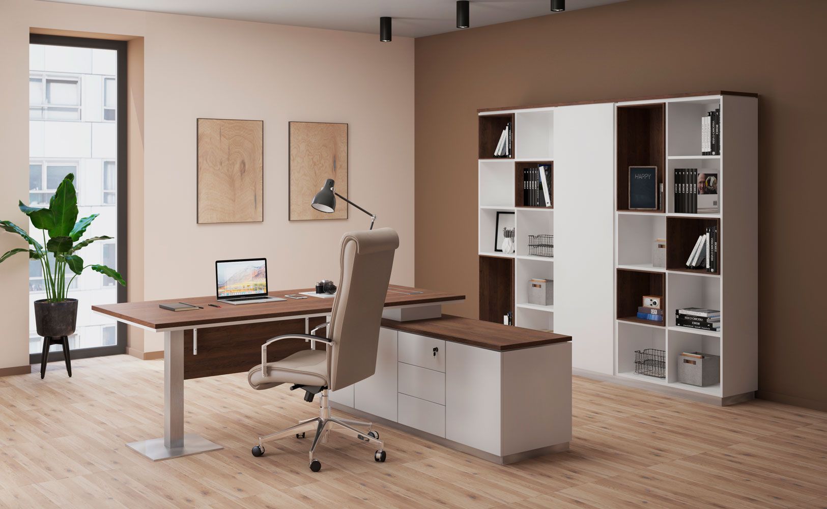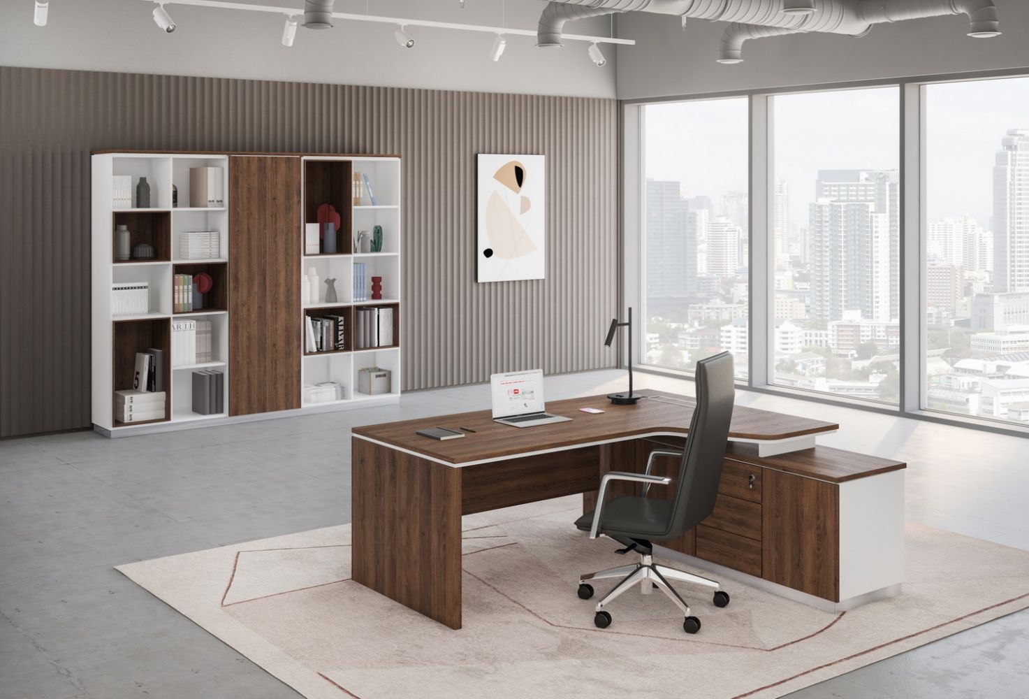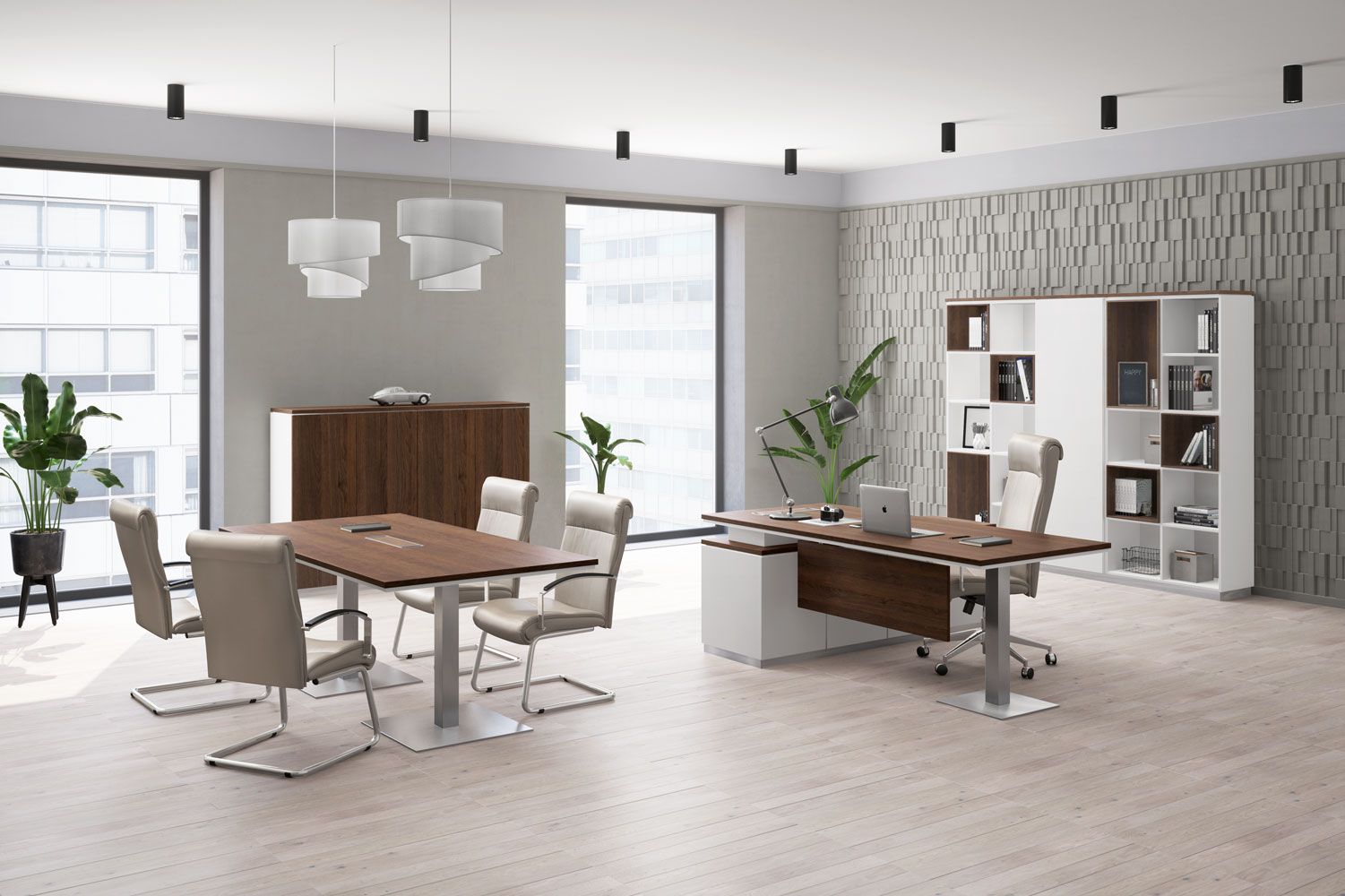 • Комбинированные столешницы с нижней частью в цвет корпусов опорных тумб.