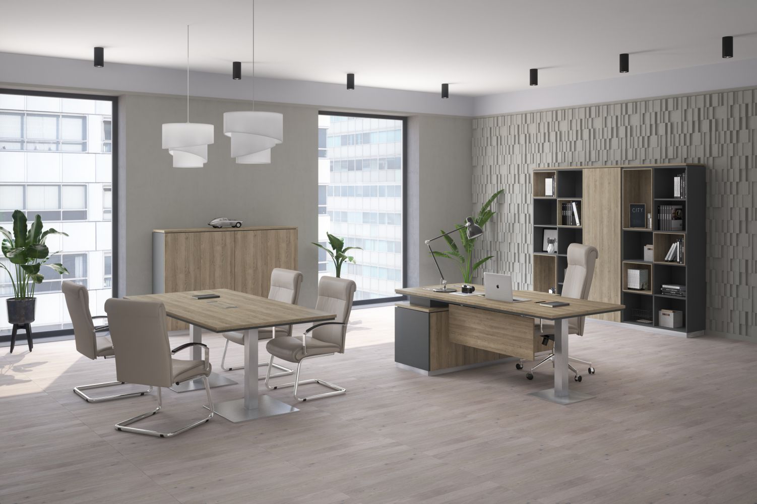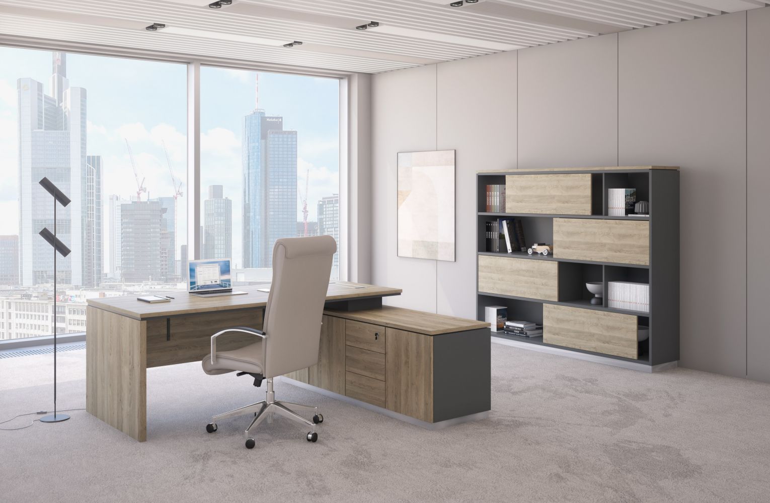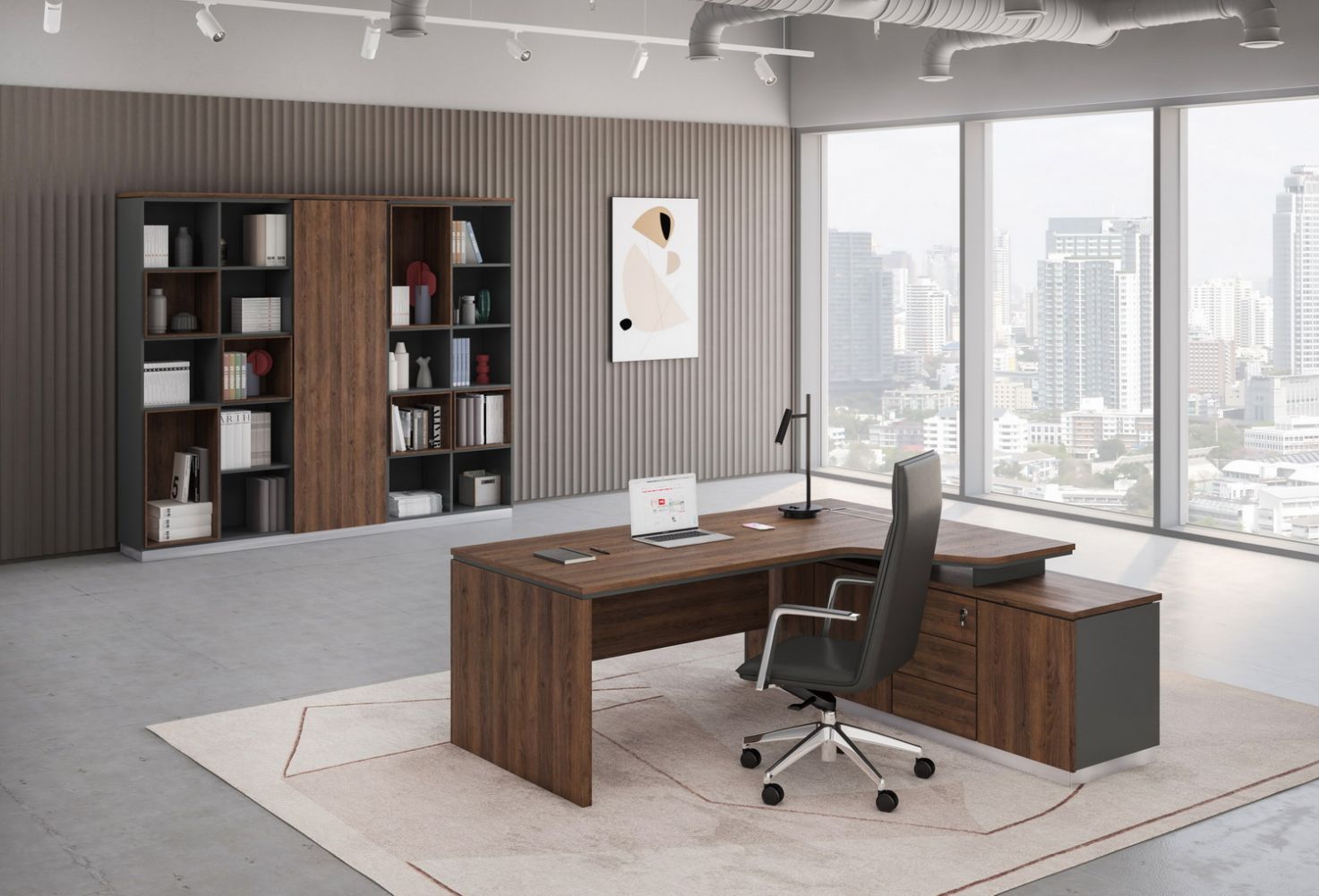 Стол руководителя эргономичный (опора ДСП) на опорной тумбе правый дуб гладстоун / антрацит премиум / дуб гладстоун СИ 120 ДГ АР ДГ