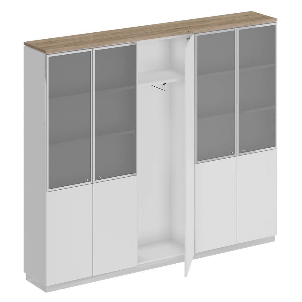 • Изделие является стенкой из двух шкафов для документов со стеклом и узкого шкафа для одежды под общим топом.