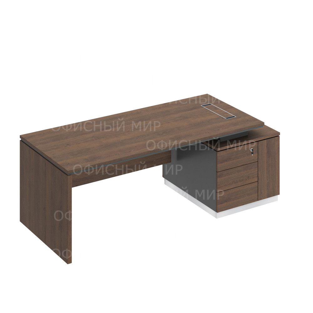 • Со стороны Пользователя опорная тумба имеет 3 выдвижных ящика, установленных на скрытые шариковые направляющие с системой встроенного демпфирования и нишу под системный блок компьютера со скрытым размещением проводки, укомплектованную распашной дверью с системой открывания Push Up (без ручек).