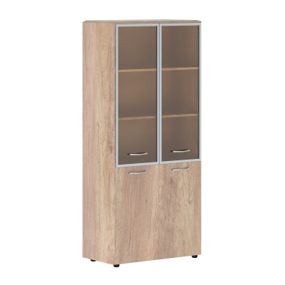Широкий комбинированный шкаф DIONI для офисного или домашнего использования. Размеры - 892х1950х470 мм, основной цвет - Дуб Каньон, дополнительный цвет - Серый. Верх шкафа имеет солидный топ с плавными фрезерованными краями. Двустворчатый шкаф оснащен 5 просторными полками, две нижние закрыты дверцами из ЛДСП под цвет конструкции, три верхние – стеклянными дверцами в алюминевой раме. На всех дверцах установлены стильные металлические ручки. Конструкция шкафа оснащена прочными силовыми креплениями – эксцентриковыми стяжками. Надежная защита всех элементов из ЛДСП – кромка ПВХ. Регулируемые по высоте опоры обеспечат шкафу устойчивость на неровном полу.
