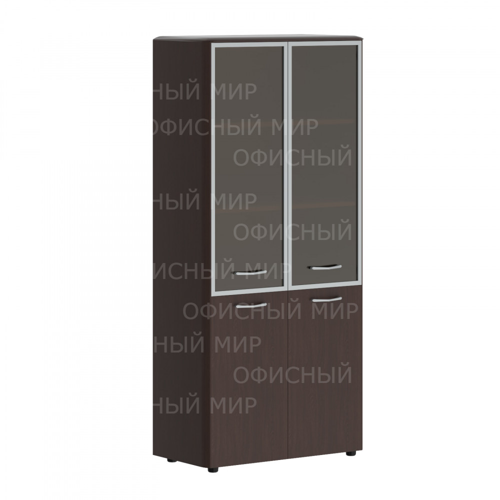 Широкий комбинированный шкаф DIONI для офисного или домашнего использования. Размеры - 892х1950х470 мм, основной цвет - Венге Магия, дополнительный цвет - Серый. Верх шкафа имеет солидный топ с плавными фрезерованными краями. Двустворчатый шкаф оснащен 5 просторными полками, две нижние закрыты дверцами из ЛДСП под цвет конструкции, три верхние – стеклянными дверцами в алюминевой раме. На всех дверцах установлены стильные металлические ручки. Конструкция шкафа оснащена прочными силовыми креплениями – эксцентриковыми стяжками. Надежная защита всех элементов из ЛДСП – кромка ПВХ. Регулируемые по высоте опоры обеспечат шкафу устойчивость на неровном полу.