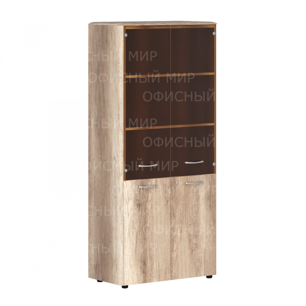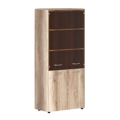 Широкий комбинированный шкаф с замком DIONI для офисного или домашнего использования. Размеры - 892х1950х470 мм, основной цвет - Дуб Каньон, дополнительный цвет - Серый. Верх шкафа имеет солидный топ с плавными фрезерованными краями. Двустворчатый шкаф оснащен 5 просторными полками, две нижние закрыты дверцами из ЛДСП под цвет конструкции, три верхние – стеклянными дверцами. На дверцах установлены стильные металлические ручки и замок для безопасности. Конструкция шкафа оснащена прочными силовыми креплениями – эксцентриковыми стяжками. Надежная защита всех элементов из ЛДСП – кромка ПВХ. Регулируемые по высоте опоры обеспечат шкафу устойчивость на неровном полу.