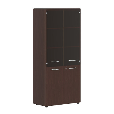 Широкий комбинированный шкаф с замком DIONI для офисного или домашнего использования. Размеры - 892х1950х470 мм, основной цвет - Венге Магия, дополнительный цвет - Серый. Верх шкафа имеет солидный топ с плавными фрезерованными краями. Двустворчатый шкаф оснащен 5 просторными полками, две нижние закрыты дверцами из ЛДСП под цвет конструкции, три верхние – стеклянными дверцами. На дверцах установлены стильные металлические ручки и замок для безопасности. Конструкция шкафа оснащена прочными силовыми креплениями – эксцентриковыми стяжками. Надежная защита всех элементов из ЛДСП – кромка ПВХ. Регулируемые по высоте опоры обеспечат шкафу устойчивость на неровном полу.