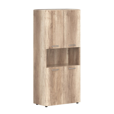 Универсальный высокий шкаф DIONI для офисного или домашнего использования. Размеры - 892х1950х470 мм, цвет – Дуб Каньон. Имеет 5 просторных полочек, нижние 2 и верхние 2 закрыты дверцами из ЛДСП, посередине одна открытая ниша. На дверцах установлены стильные металлические ручки. Верх шкафа имеет солидный топ с плавными фрезерованными краями. Конструкция оснащена прочными силовыми креплениями – эксцентриковыми стяжками. Все торцы основных элементов из ЛДСП надежно защищены кромкой ПВХ – 2 мм. Солидные и долговечные опоры регулируются по высоте, что придаст шкафу устойчивость на неровном полу.