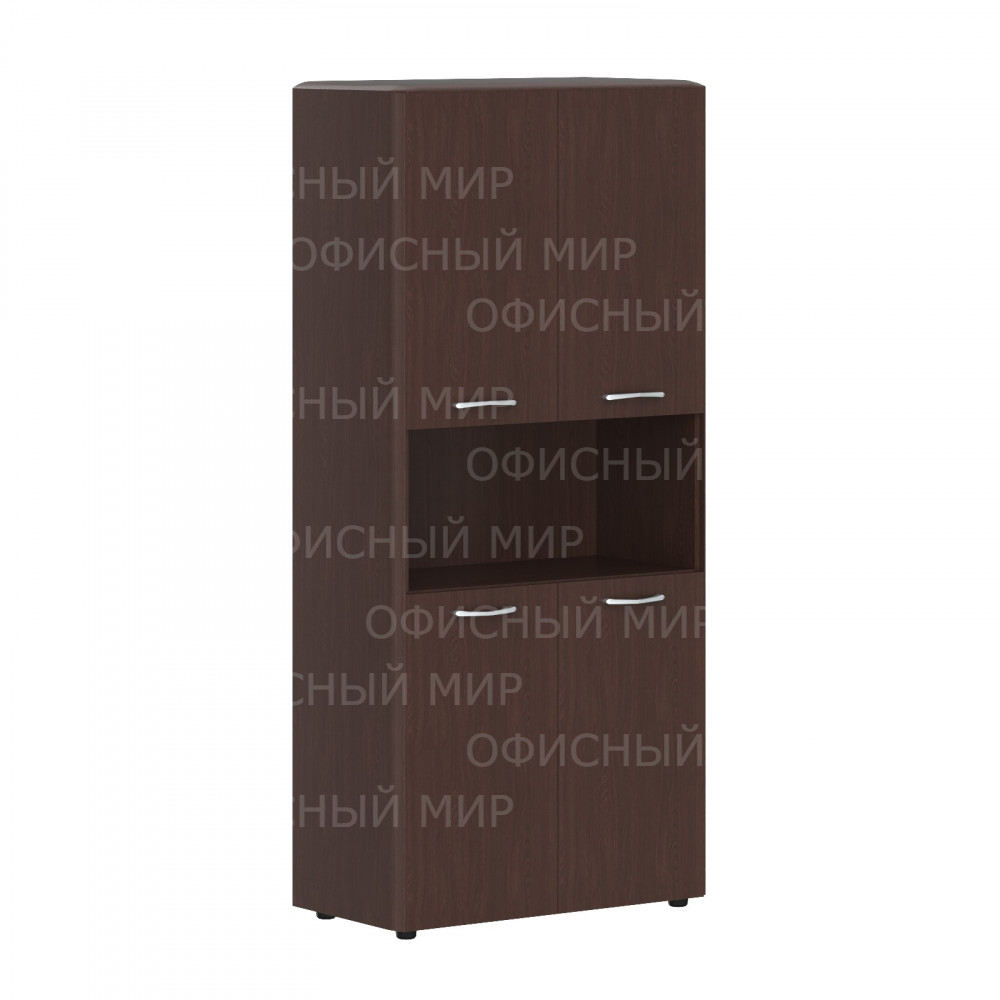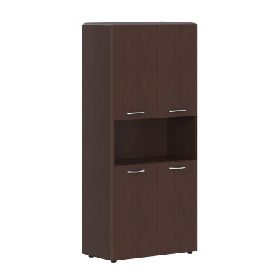 Универсальный высокий шкаф DIONI для офисного или домашнего использования. Размеры - 892х1950х470 мм, цвет – Венге Магия. Имеет 5 просторных полочек, нижние 2 и верхние 2 закрыты дверцами из ЛДСП, посередине одна открытая ниша. На дверцах установлены стильные металлические ручки. Верх шкафа имеет солидный топ с плавными фрезерованными краями. Конструкция оснащена прочными силовыми креплениями – эксцентриковыми стяжками. Все торцы основных элементов из ЛДСП надежно защищены кромкой ПВХ – 2 мм. Солидные и долговечные опоры регулируются по высоте, что придаст шкафу устойчивость на неровном полу.