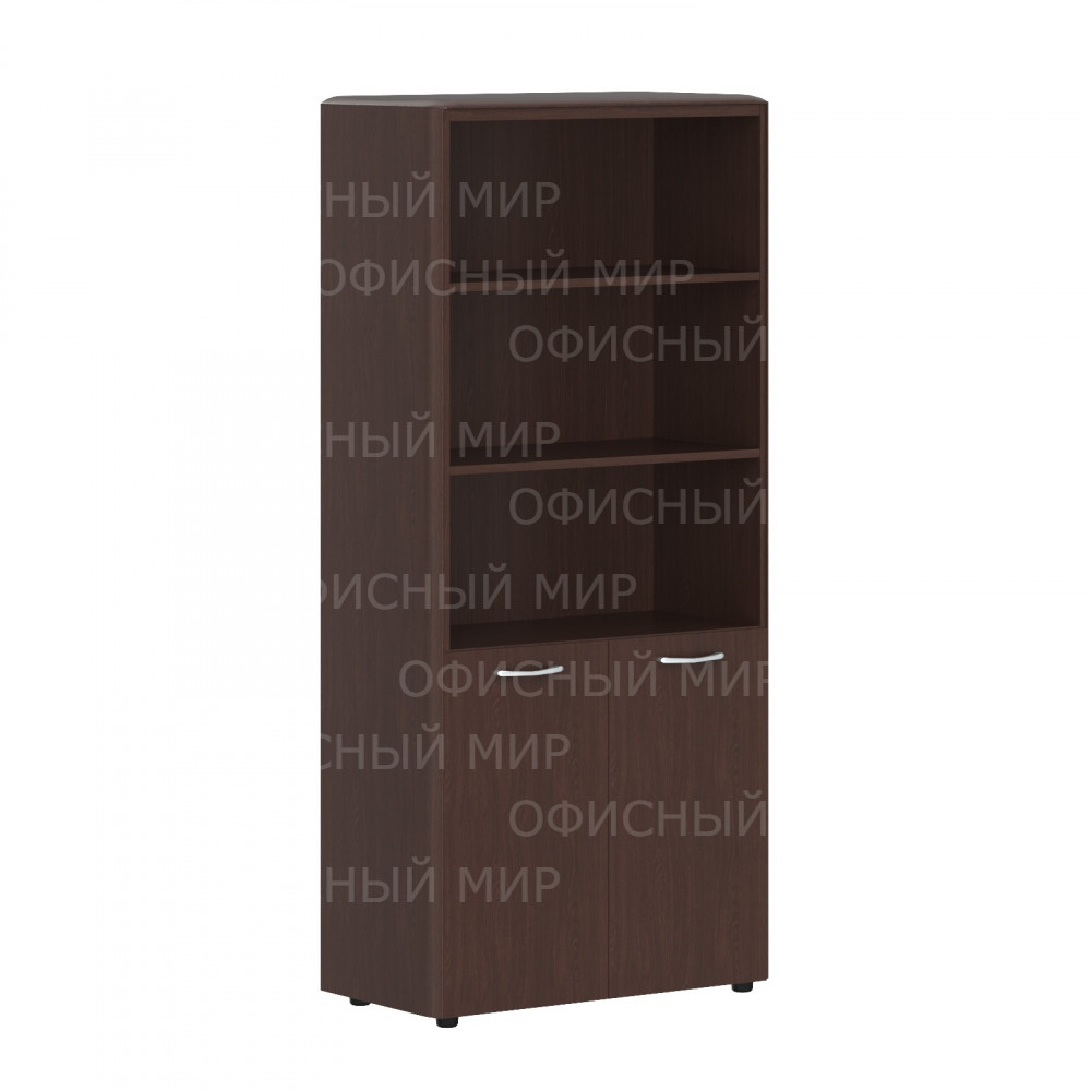 Широкий шкаф-стеллаж DIONI для офисного или домашнего использования. Размеры - 892х1950х470 мм, основной цвет - Венге Магия, дополнительный цвет - Серый. Верх шкафа имеет солидный топ с плавными фрезерованными краями. Двустворчатый шкаф оснащен 5 просторными полками, две нижние закрыты дверцами из ЛДСП под цвет конструкции, три верхние – открытые. На дверцах установлены стильные металлические ручки. Конструкция шкафа оснащена прочными силовыми креплениями – эксцентриковыми стяжками. Надежная защита всех элементов из ЛДСП – кромка ПВХ. Регулируемые по высоте опоры обеспечат шкафу устойчивость на неровном полу.