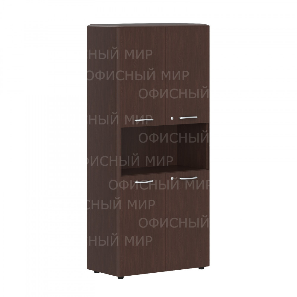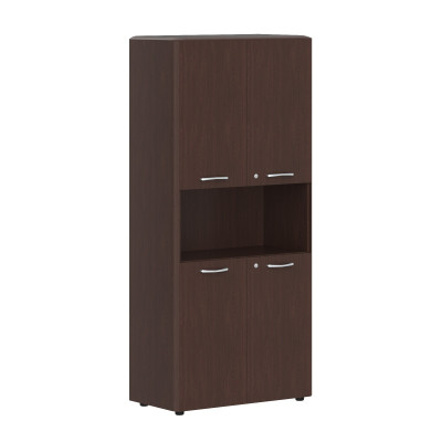 Универсальный высокий шкаф с замком DIONI для офисного или домашнего использования. Размеры - 892х1950х470 мм, цвет – Венге Магия. Имеет 5 просторных полочек, нижние 2 и верхние 2 закрыты дверцами из ЛДСП, посередине одна открытая ниша. На дверцах установлены стильные металлические ручки и замок для безопасности. Верх шкафа имеет солидный топ с плавными фрезерованными краями. Конструкция оснащена прочными силовыми креплениями – эксцентриковыми стяжками. Все торцы основных элементов из ЛДСП надежно защищены кромкой ПВХ – 2 мм. Солидные и долговечные опоры регулируются по высоте, что придаст шкафу устойчивость на неровном полу.
