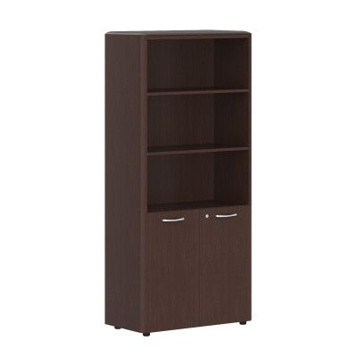 Широкий шкаф-стеллаж с замком DIONI для офисного или домашнего использования. Размеры - 892х1950х470 мм, основной цвет - Венге Магия, дополнительный цвет - Серый. Верх шкафа имеет солидный топ с плавными фрезерованными краями. Двустворчатый шкаф оснащен 5 просторными полками, две нижние закрыты дверцами из ЛДСП под цвет конструкции, три верхние – открытые. На дверцах установлены стильные металлические ручки и замок для безопасности. Конструкция шкафа оснащена прочными силовыми креплениями – эксцентриковыми стяжками. Надежная защита всех элементов из ЛДСП – кромка ПВХ. Регулируемые по высоте опоры обеспечат шкафу устойчивость на неровном полу.