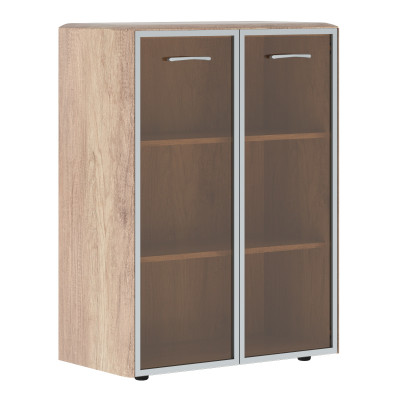 Широкий средний шкаф DIONI для офисного или домашнего использования. Размеры - 892х1185х470 мм, основной цвет - Дуб Каньон, дополнительный цвет - Серый. Верх шкафа имеет солидный топ с плавными фрезерованными краями. Двустворчатый шкаф оснащен 3 просторными полками, которые закрываются стеклянными дверцами в алюминевой раме. На дверцах установлены стильные металлические ручки. Конструкция шкафа оснащена прочными силовыми креплениями – эксцентриковыми стяжками. Надежная защита всех элементов из ЛДСП – кромка ПВХ. Регулируемые по высоте опоры обеспечат шкафу устойчивость на неровном полу.