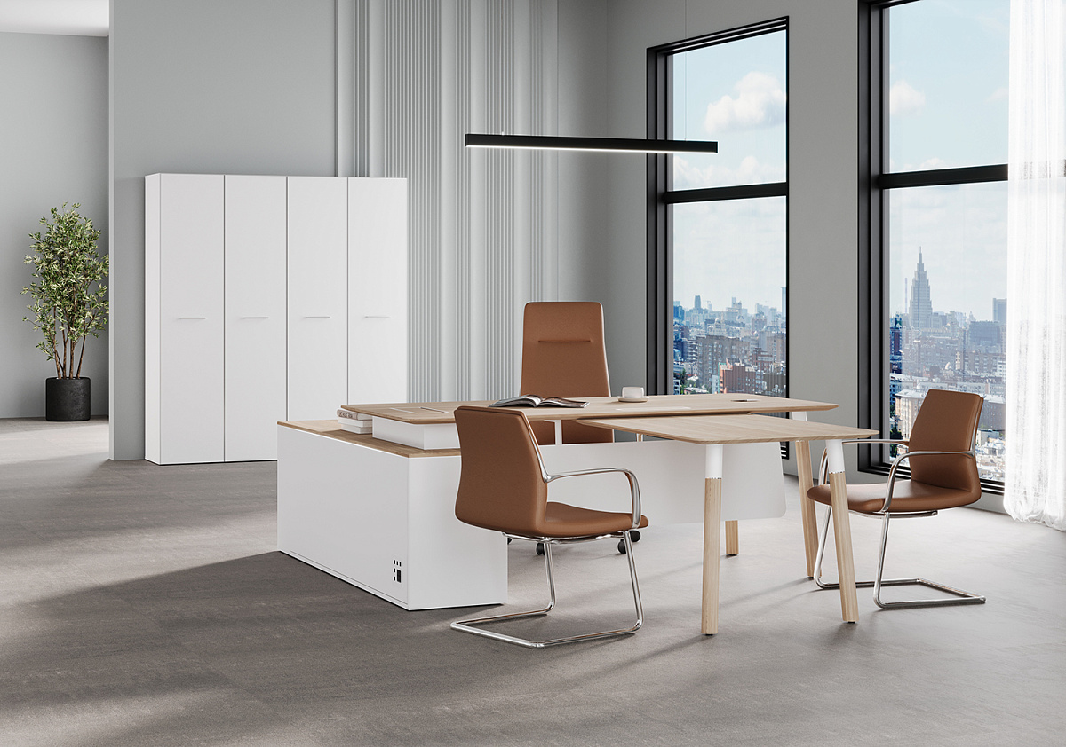 Кабинет Fresco — это истинный стиль для самых взыскательных руководителей! Столешницы и опоры, выполненные из массива дерева, дополненные декоративными проставками из нержавеющей стали, создают впечатляющий дизайн, в котором гармонично сочетаются классика и современность. Этот кабинет не просто функциональное пространство, а настоящая жемчужина, поражающая своим вниманием к деталям.