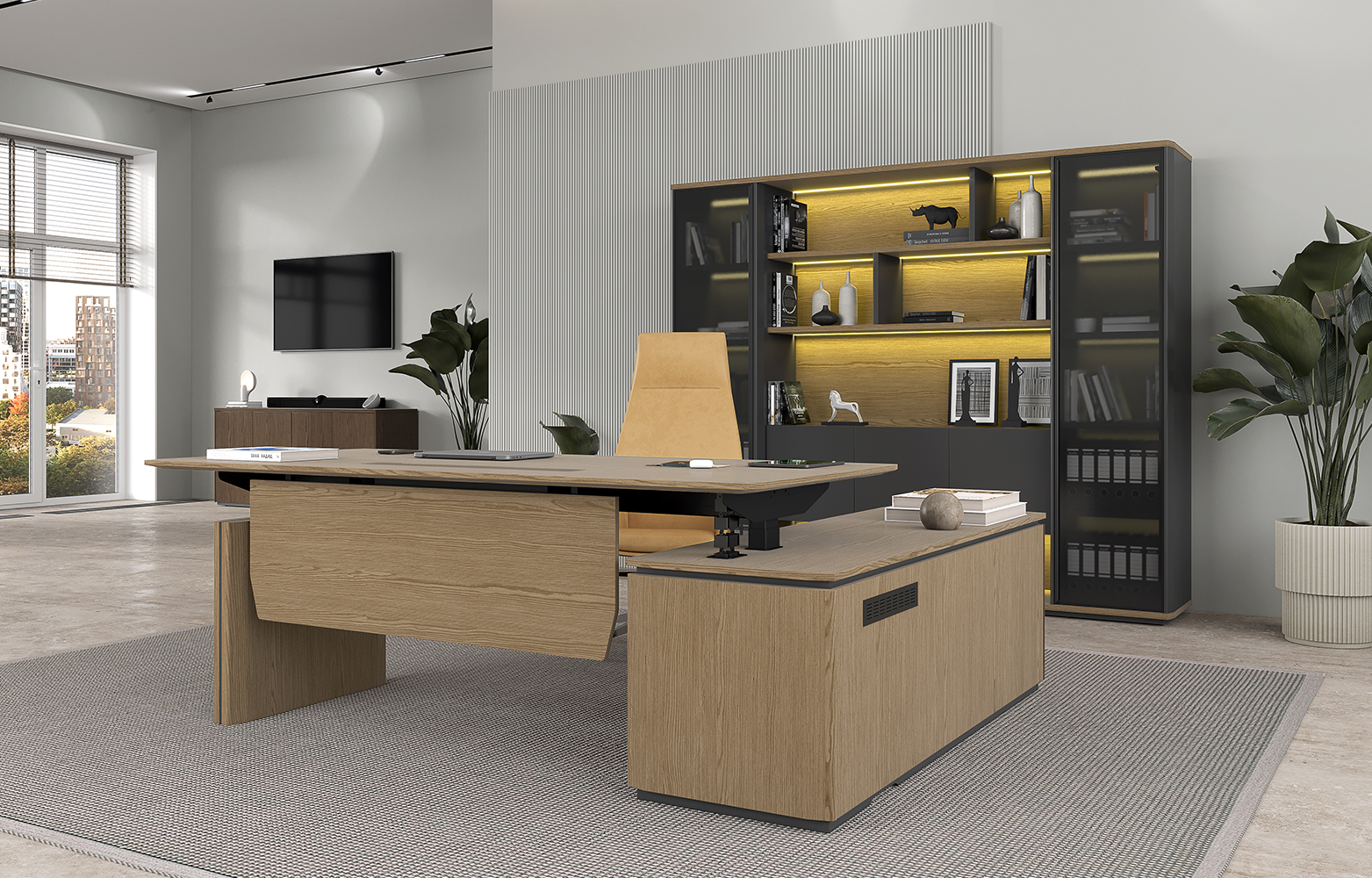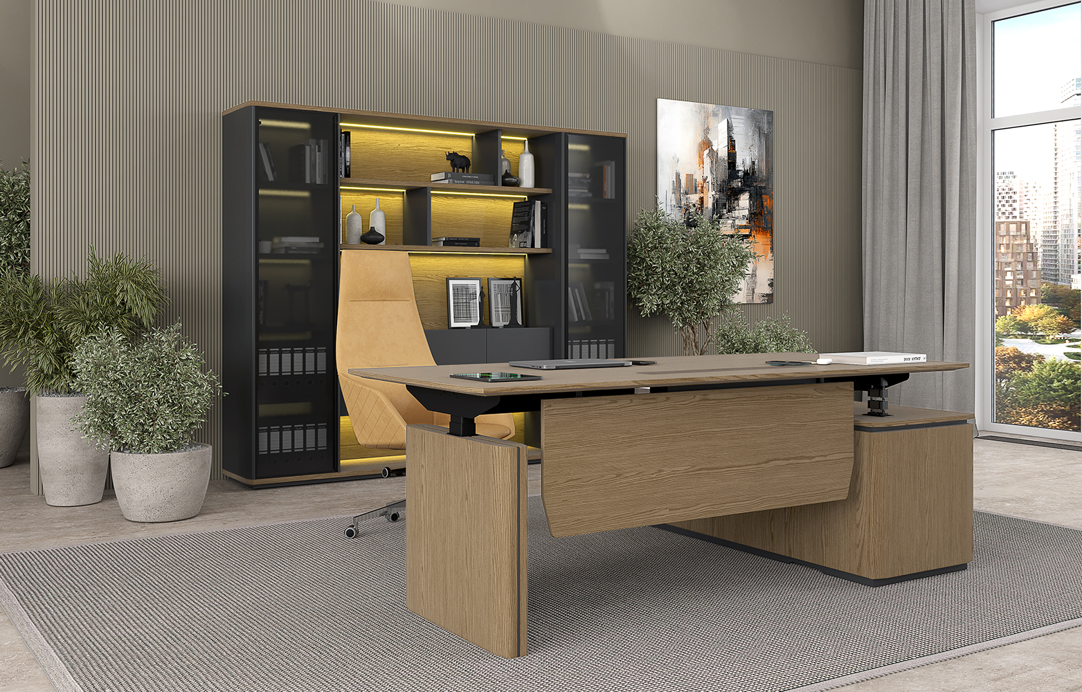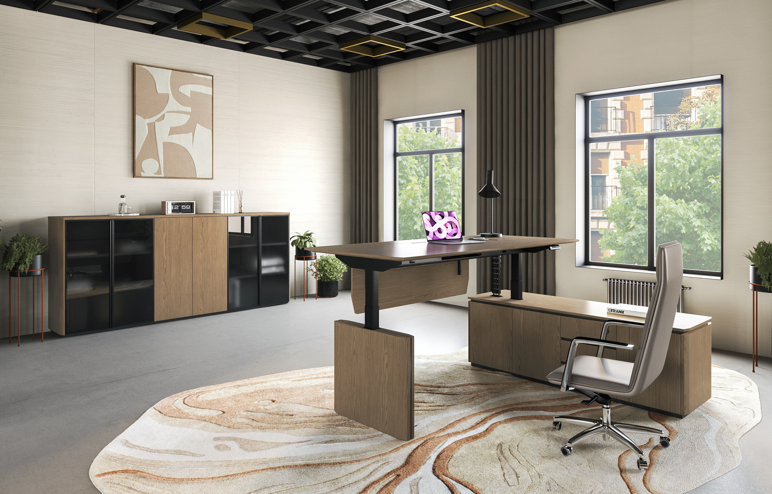 - Подъемный электрический механизм в столах руководителя для работы «сидя-стоя» с памятью четырёх уровней высоты, которые легко устанавливаются кнопками, что создает дополнительный комфорт в течении рабочего дня.