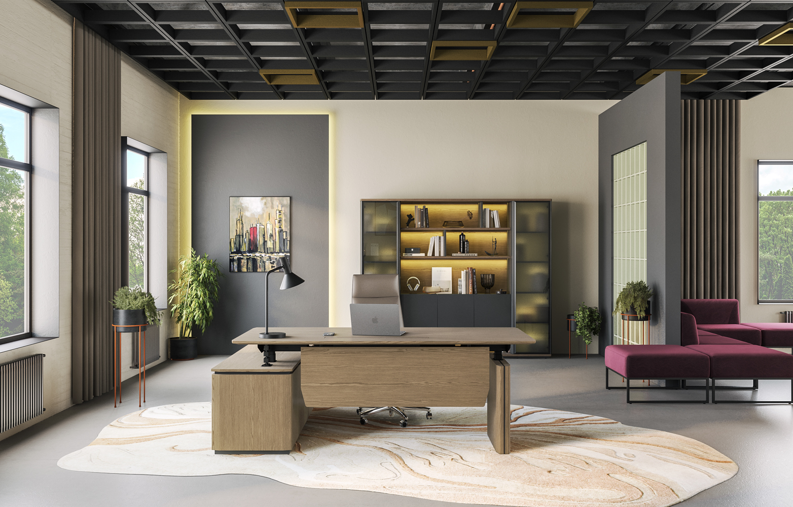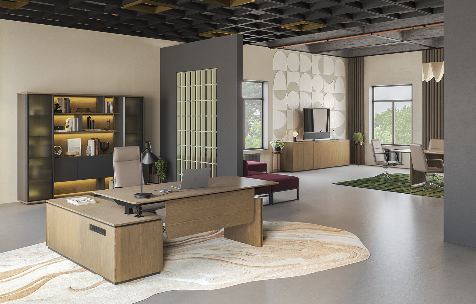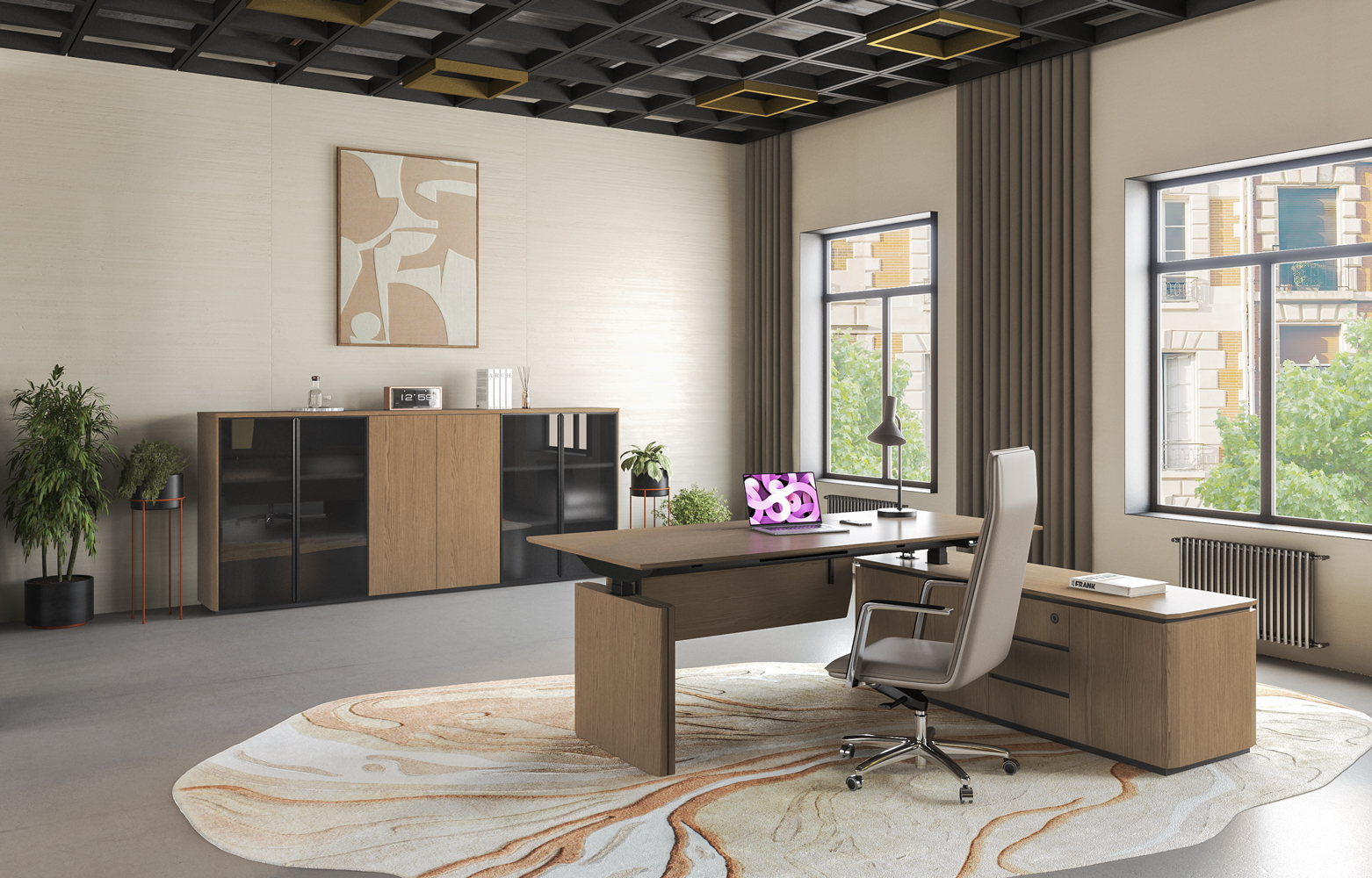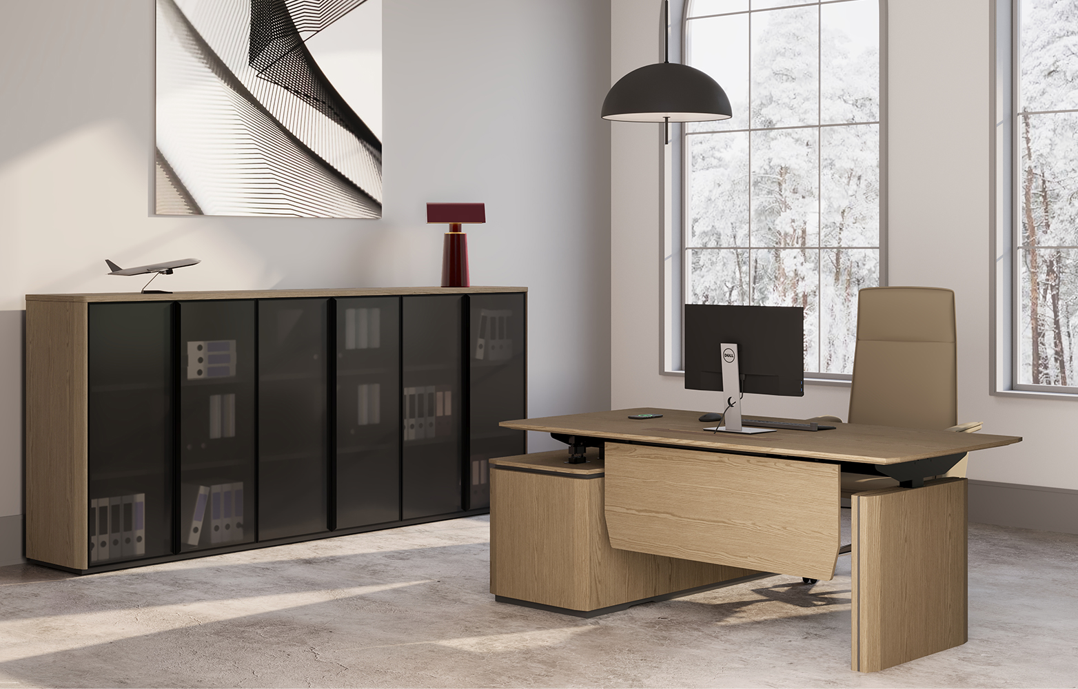 - Подъемный электрический механизм в столах руководителя для работы «сидя-стоя» с памятью четырёх уровней высоты, которые легко устанавливаются кнопками, что создает дополнительный комфорт в течении рабочего дня.