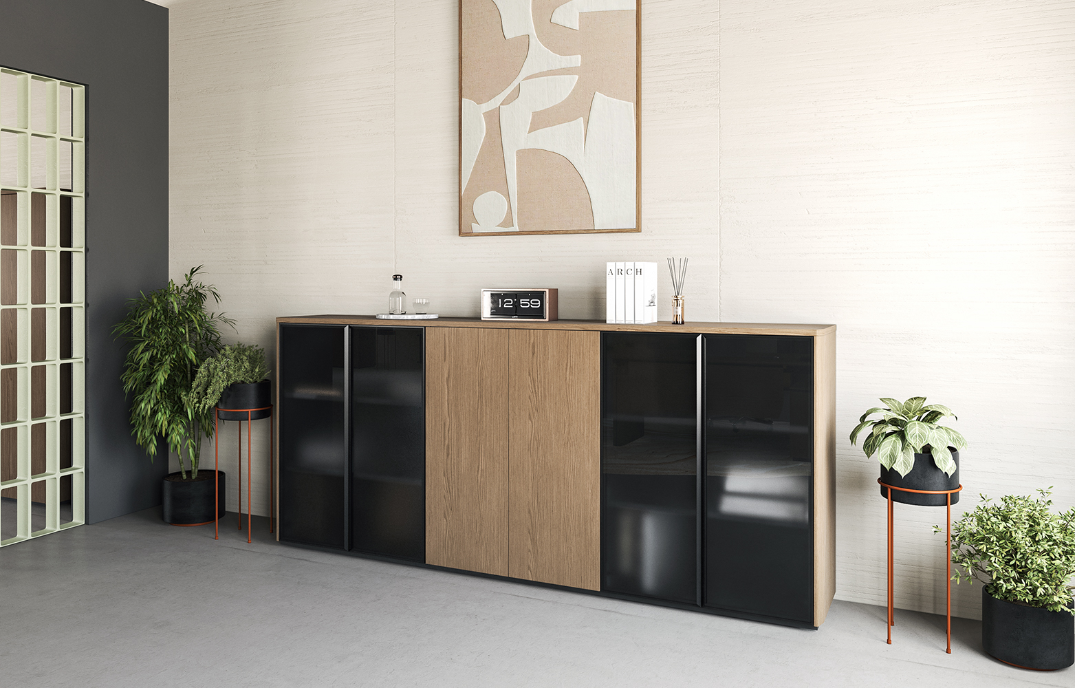 - Стеклянные дверцы высокого и среднего уровня в рамке из алюминиевого профиля черного цвета с интегрированной алюминиевой ручкой на вертикальной планке, стекло «серый сатин».