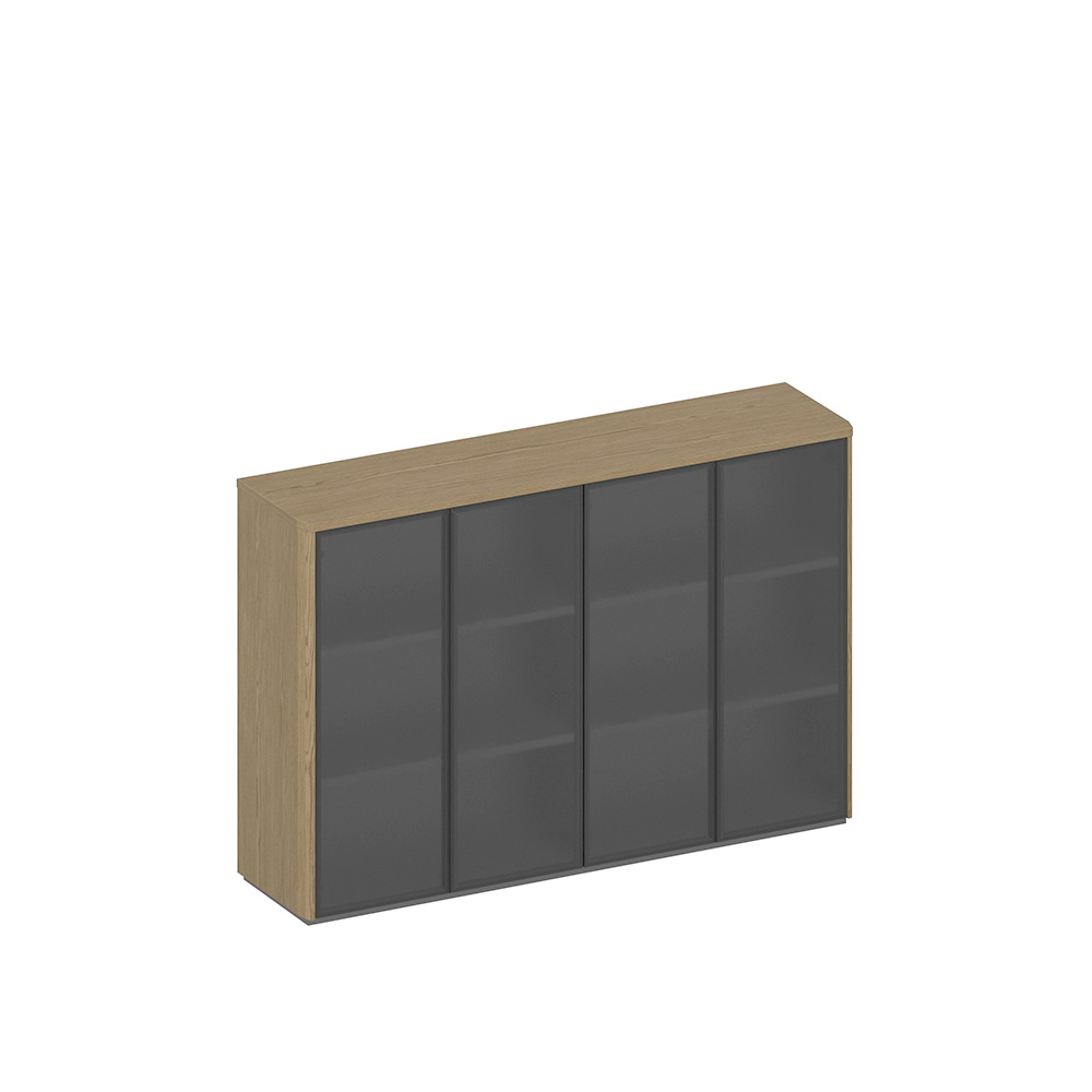 Стеклянные дверцы высокого и среднего уровня в рамке из алюминиевого профиля черного цвета с интегрированной алюминиевой ручкой на вертикальной планке, стекло «серый сатин».
