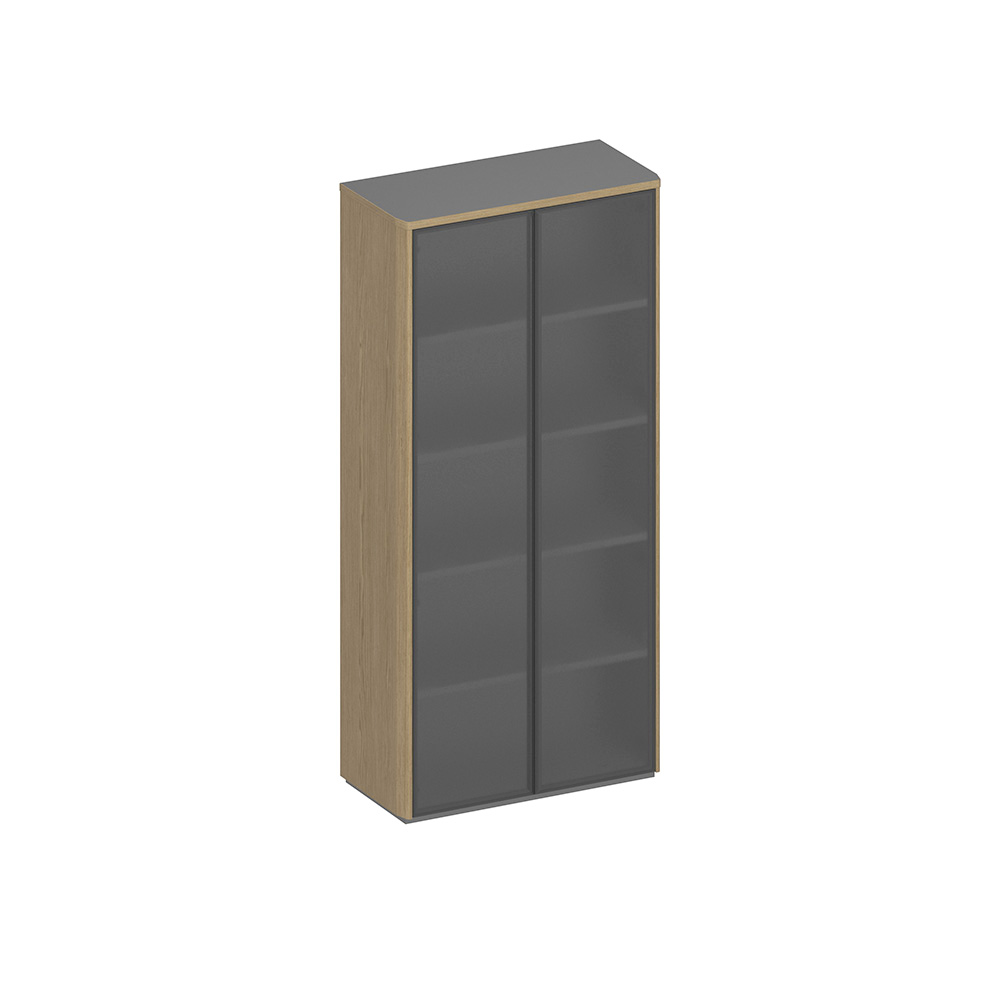 Стеклянные дверцы высокого и среднего уровня в рамке из алюминиевого профиля черного цвета с интегрированной алюминиевой ручкой на вертикальной планке, стекло «серый сатин».