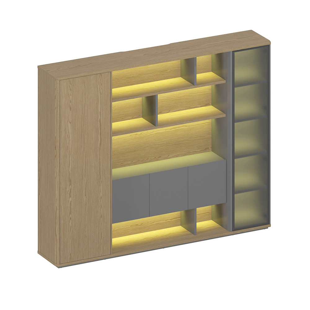 Светодиодная подсветка полок в открытой секции и за стеклянной двери узкой секции шкафа, включение подсветки сенсорное, осуществляется касанием руки.